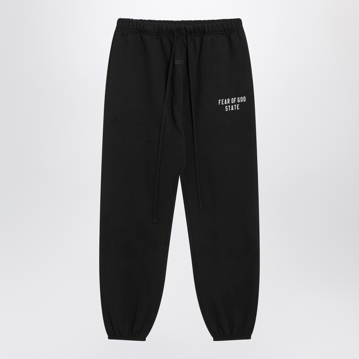 Black cotton blend jogging trousers from Fear Of God Essentials featuring an elasticated waistband with drawstring, two side welt pockets, contrasting lettering logo print on the front and rubberized logo patch on the front.