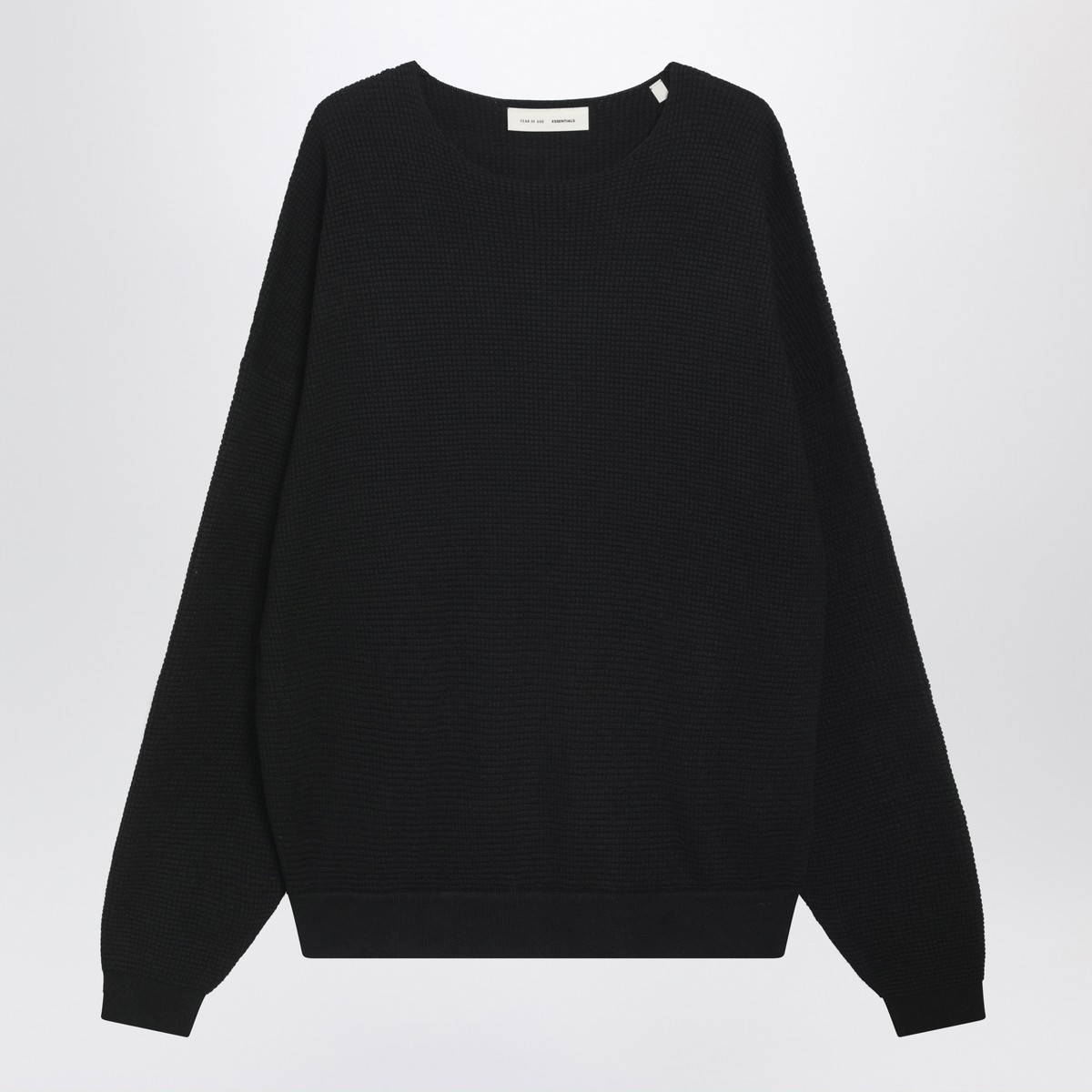 Fear Of God Essentials heavy black vintage-effect waffle crewneck sweatshirt featuring an oversized silhouette, long sleeves, dropped shoulders for a relaxed drape, ribbed cuffs and hem, and a rubberized logo-lettering patch on the back.