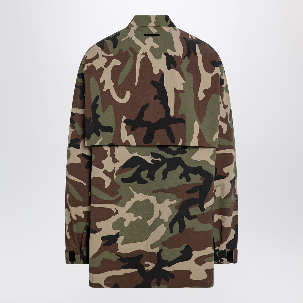 Recycled nylon blend camouflage-patterned over shirt jacket by Fear Of God Essentials, features a classic collar, front button placket, long sleeves with elasticated Velcro-adjustable cuffs, straight hem and rubberized logo patch on the back.