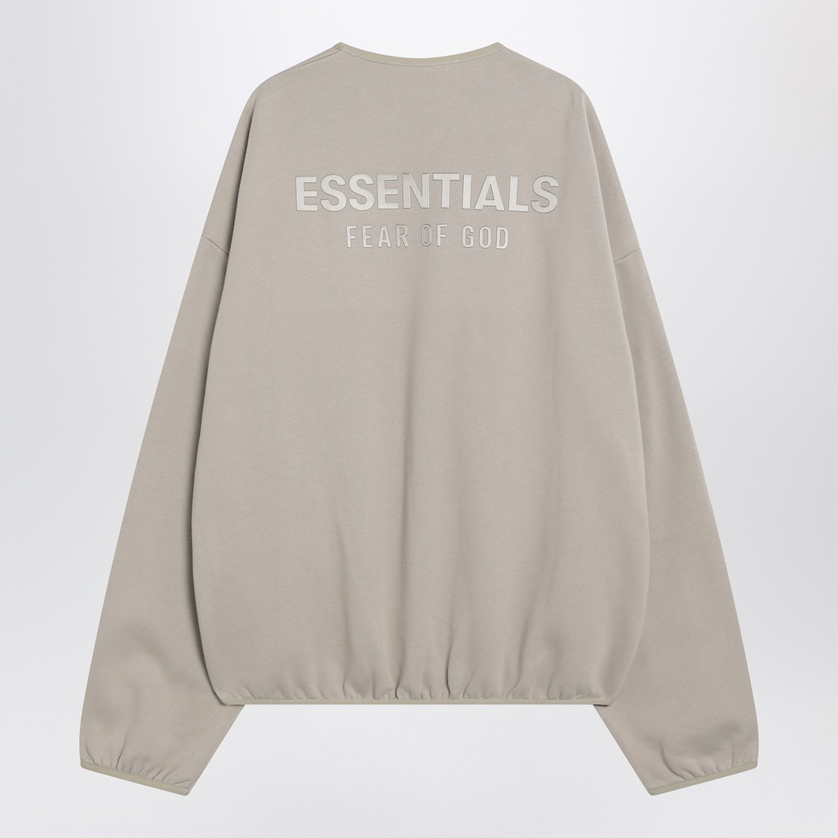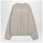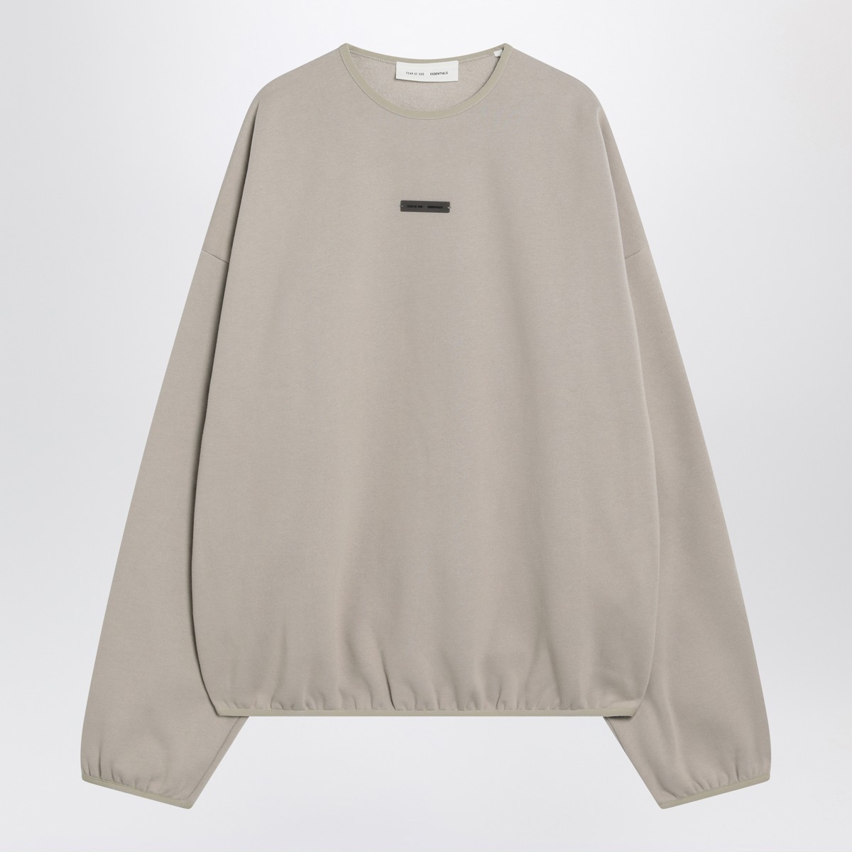 Crewneck sweatshirt by Fear Of God Essentials in greige brushed cotton, featuring long sleeves, front logo patch, elasticated cuffs and hem, dropped shoulders, and raised rear logo lettering.