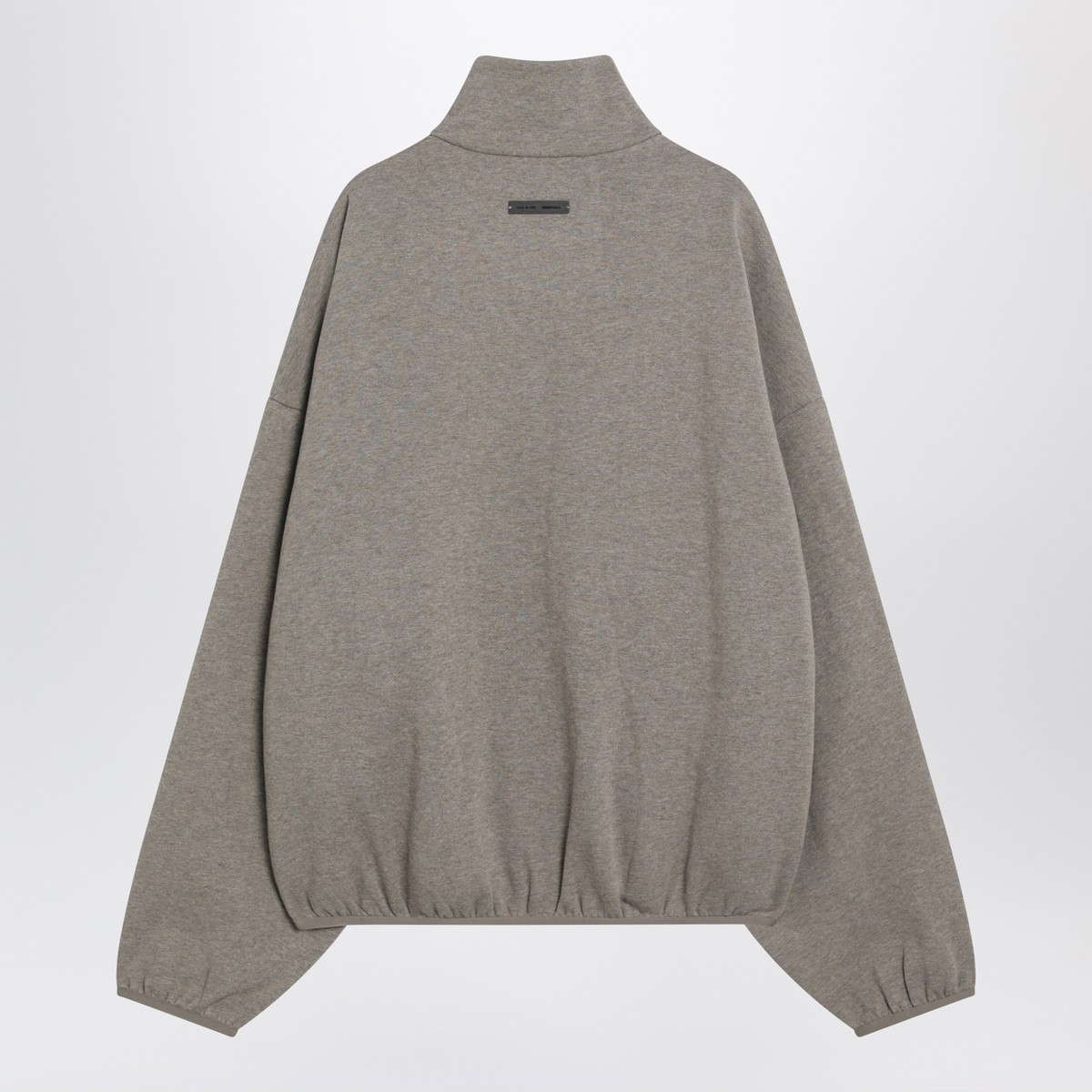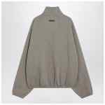 Sweatshirt by Fear Of God Essentials in grey brushed cotton, featuring front double‑zip closure, long sleeves, stand‑up collar, tone‑on‑tone chest logo embroidery, two side pockets, rear logo patch, and elasticated cuffs and hem.