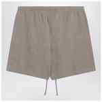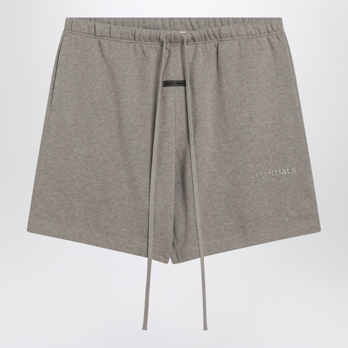 Shorts by Fear Of God Essentials in grey cotton blend, featuring an elasticated waistband with drawstring, two side pockets, front logo patch, and raised front logo lettering.