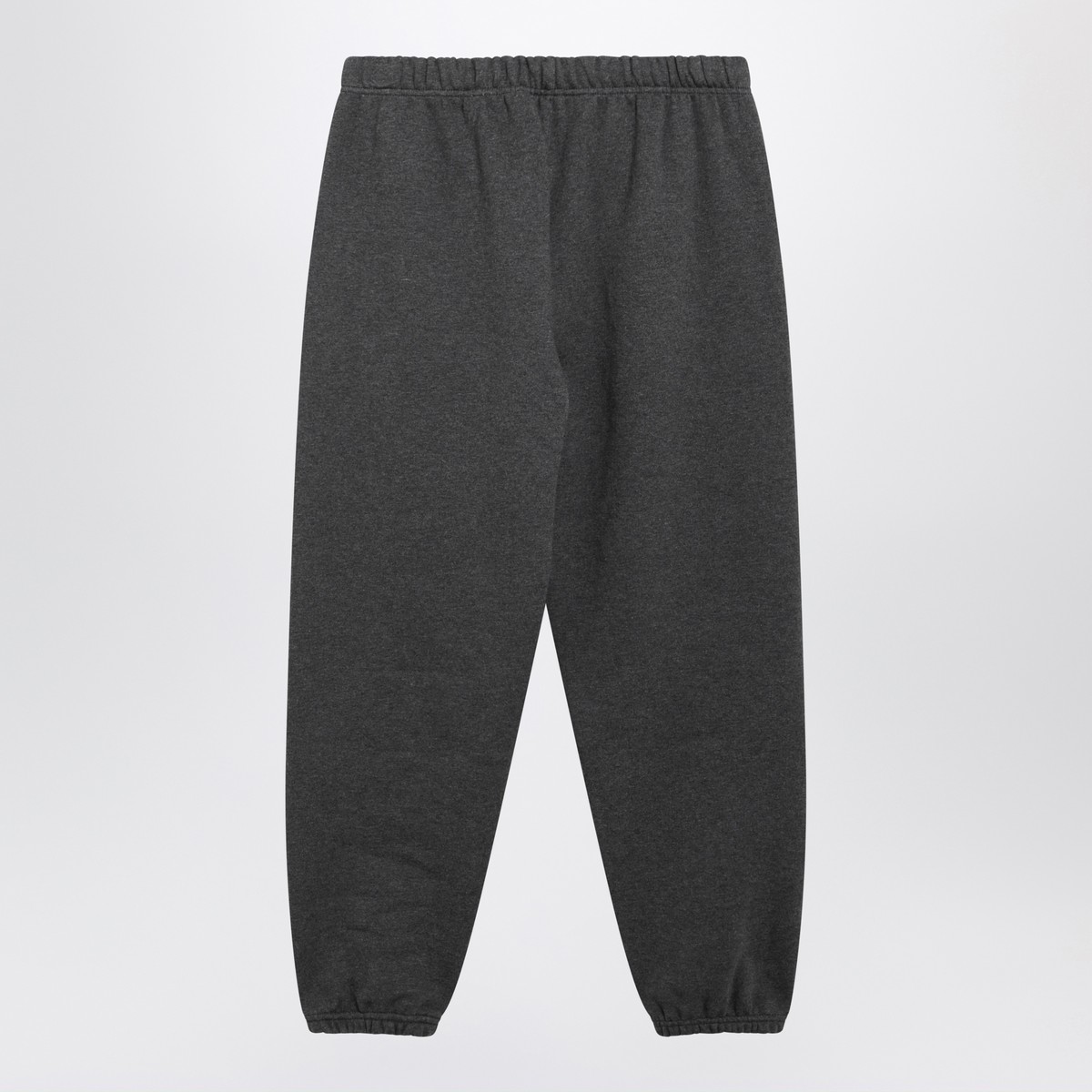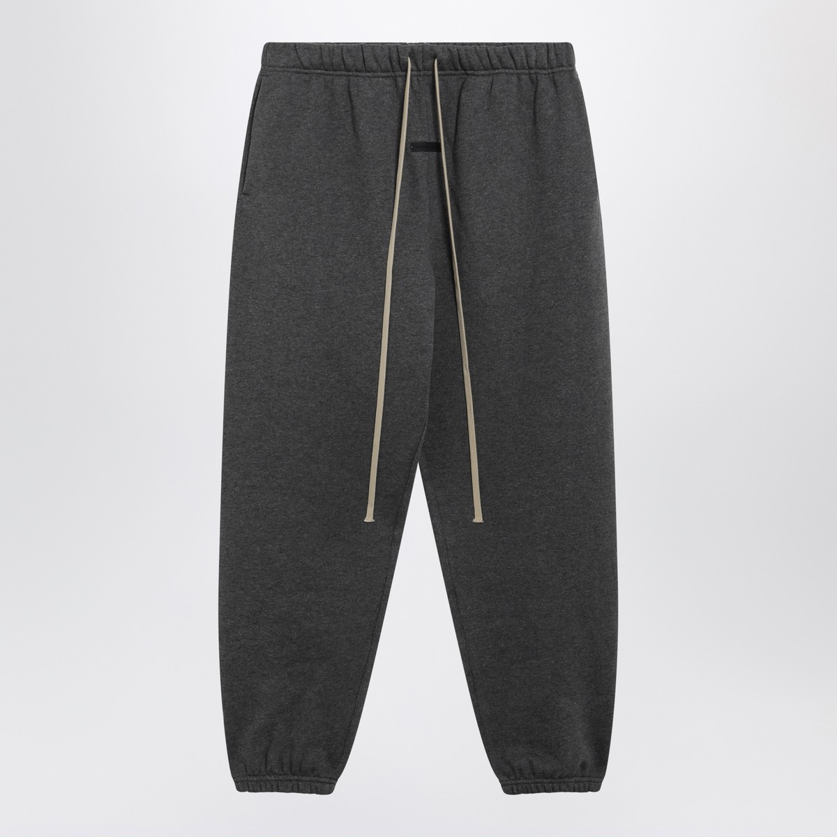 Dark grey cotton-blend jogging trousers by Fear of God Essentials, featuring an elasticated drawstring waist, two side pockets, elasticated cuffs and front rubber logo patch.