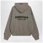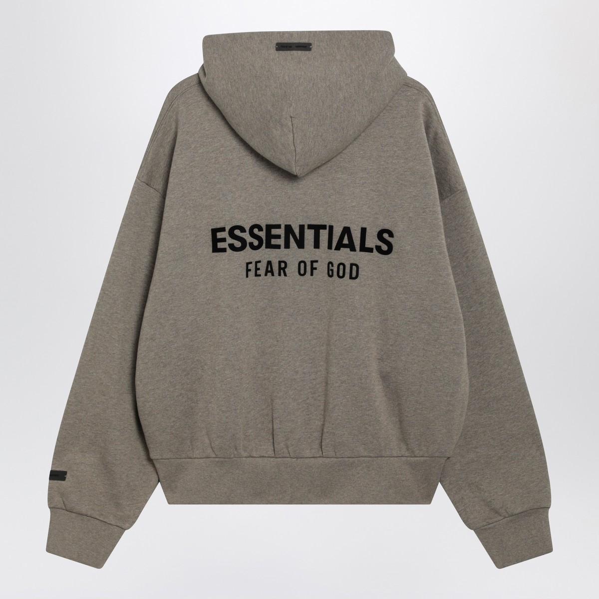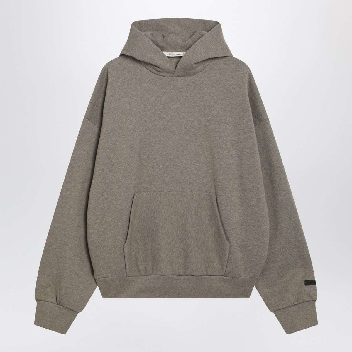 Grey mélange cotton-blend hoodie by Fear of God Essentials, featuring a front kangaroo pocket, long sleeves with embossed-logo wrist patch, dropped shoulders, double-layer hood with embossed-logo patch, contrasting back logo lettering and ribbed trims.