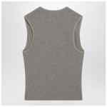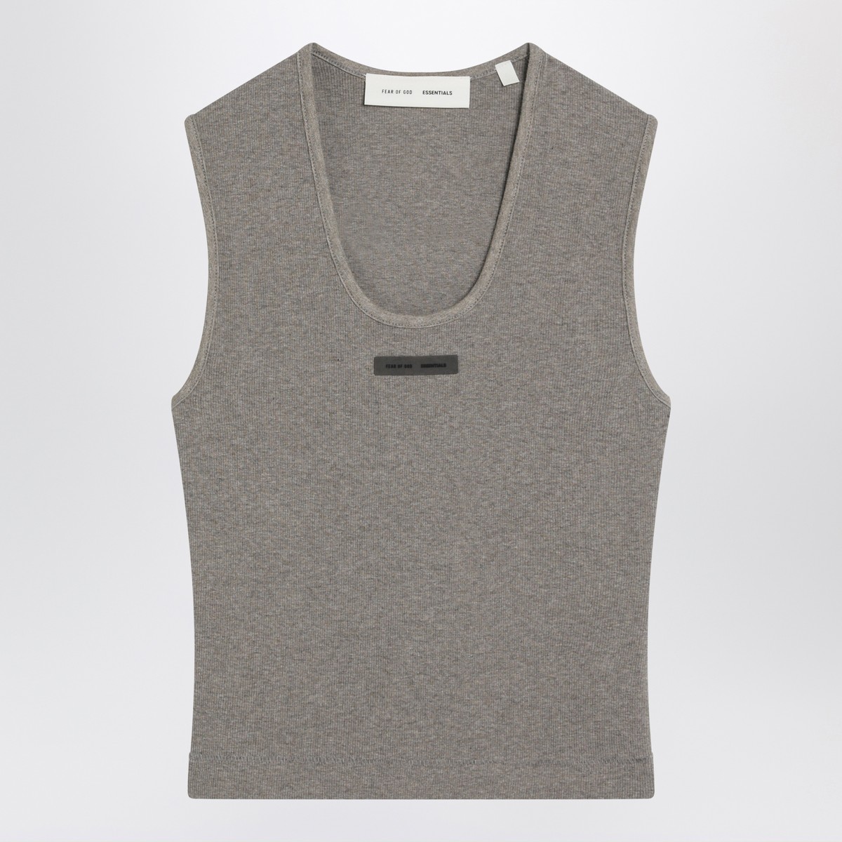 Sleeveless grey cotton-blend tank top by Fear Of God Essentials, featuring wide U-neck, ribbed design, and front logo patch.