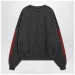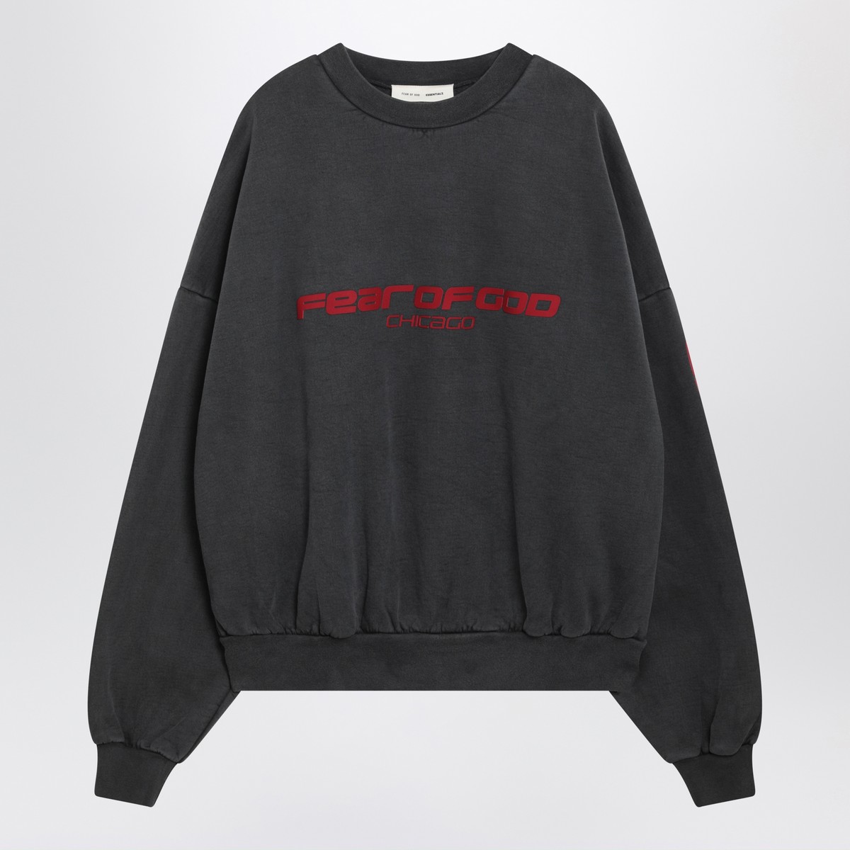 Vintage-effect grey cotton crewneck sweatshirt by Fear of God Essentials, featuring long sleeves with contrasting print, dropped shoulders, embossed-logo patch on the back, contrasting chest logo lettering, cropped relaxed fit and ribbed trims.