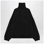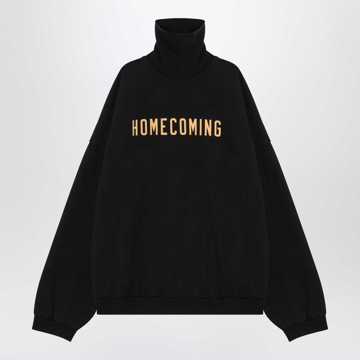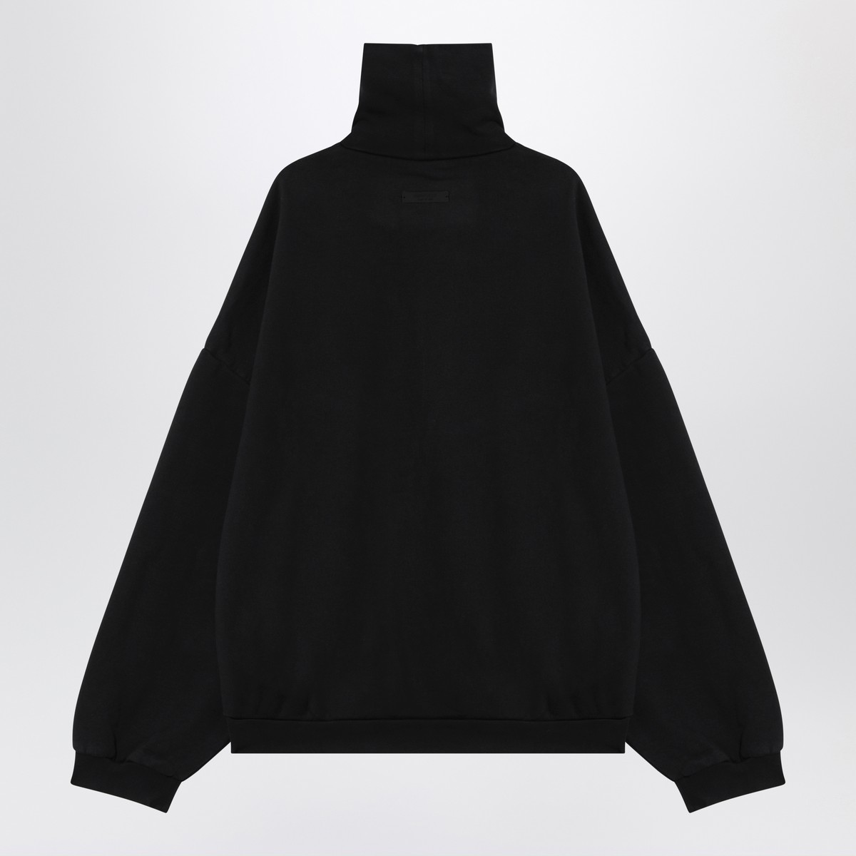Fear Of God Essentials sweatshirt in black brushed cotton blend, featuring long sleeves, a high collar, a rubber logo patch on the back, ribbed edges, two side welt pockets, and a contrasting Homecoming print on the front.