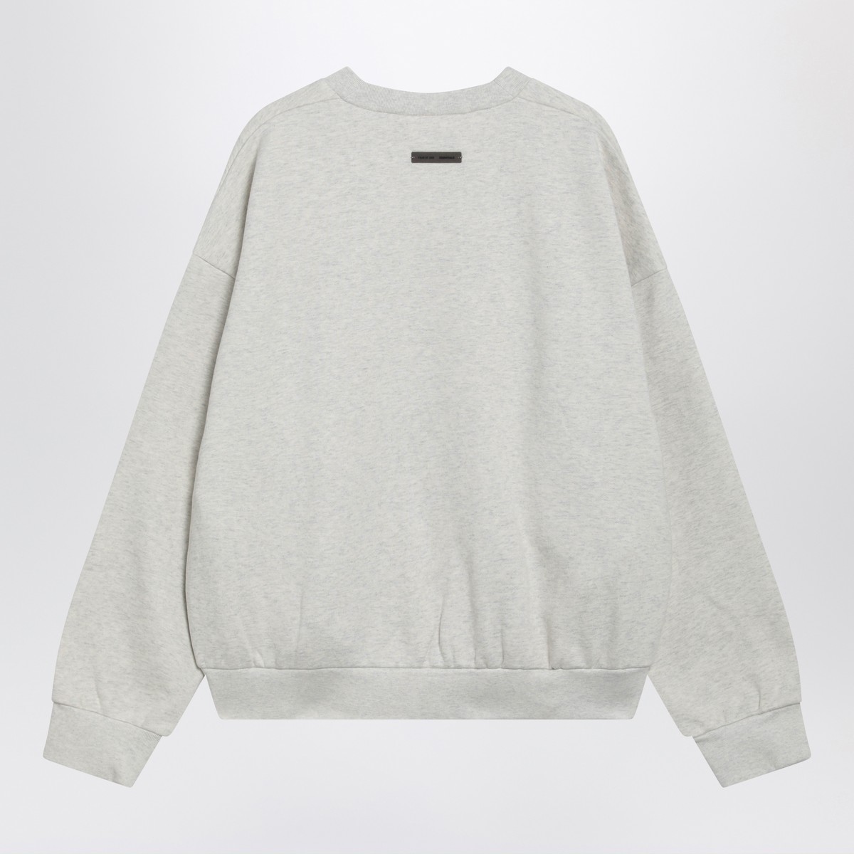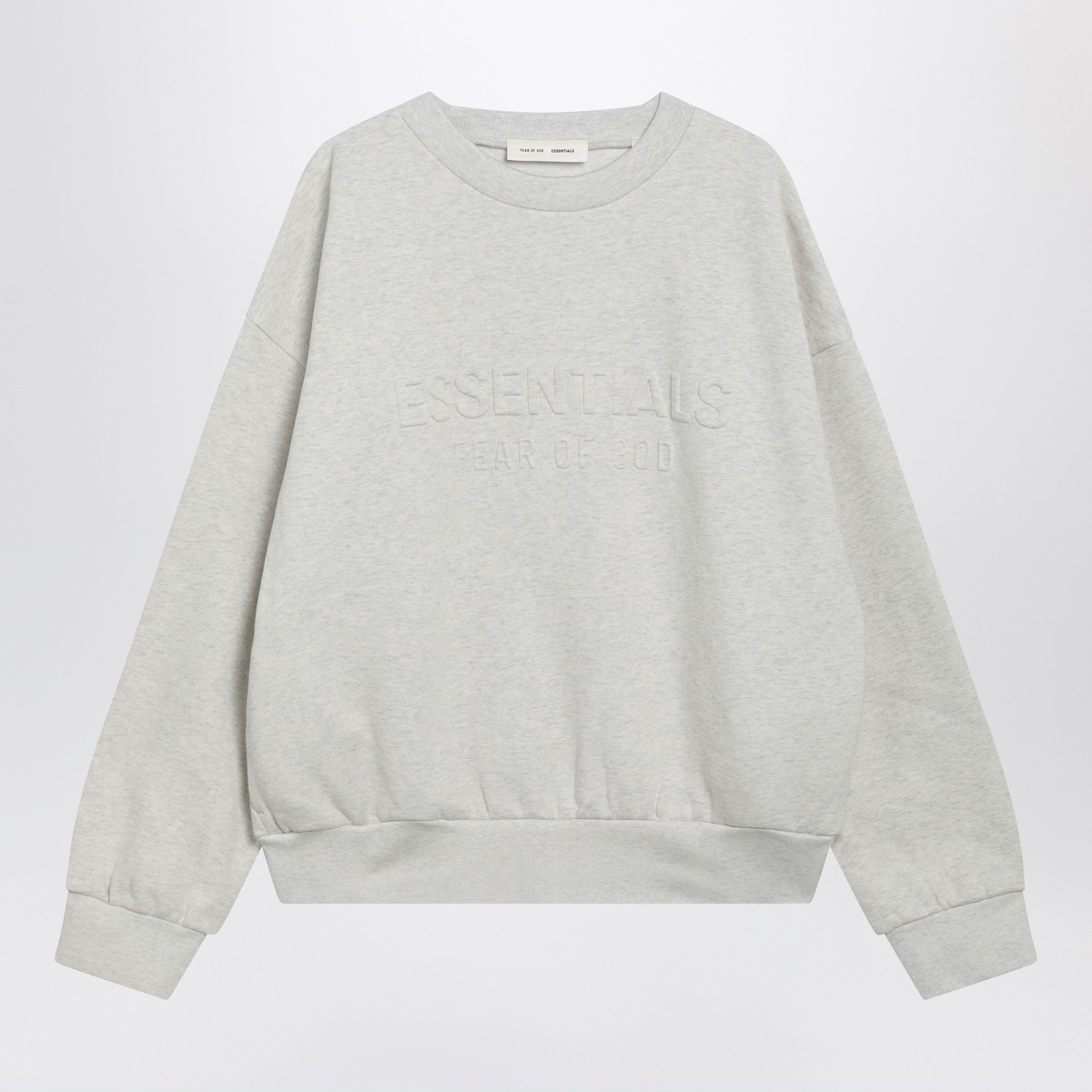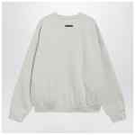 Light grey mélange brushed cotton-blend crewneck sweatshirt by Fear of God Essentials, featuring long sleeves, dropped shoulders, embossed-logo patch on the back, tone-on-tone raised chest logo lettering and ribbed trims.