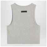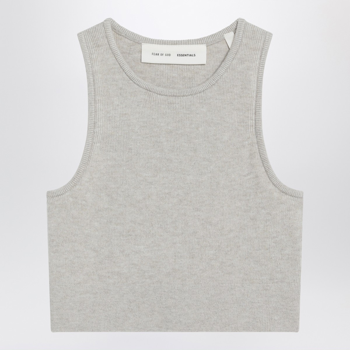 Cropped crewneck top by Fear Of God Essentials in greige nylon blend, featuring ribbed design and rear logo patch.