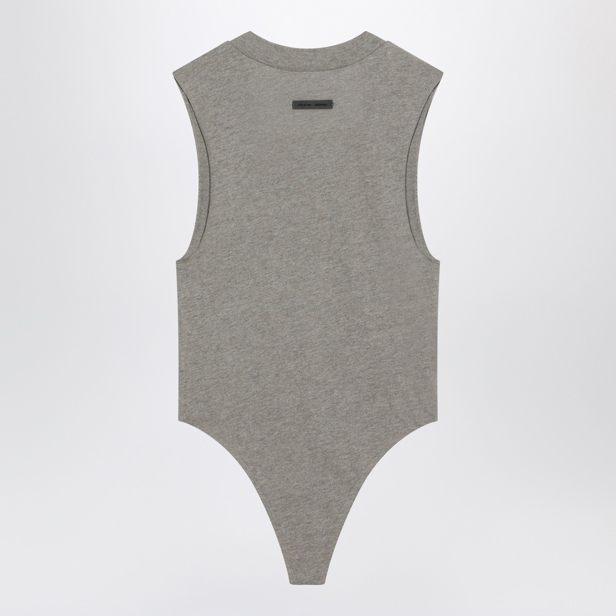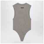 Sleeveless bodysuit by Fear Of God Essentials in grey cotton blend, featuring ribbed crew neck, logo patch on front and back, wide armholes, and snap closure at the crotch.
