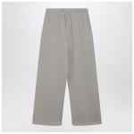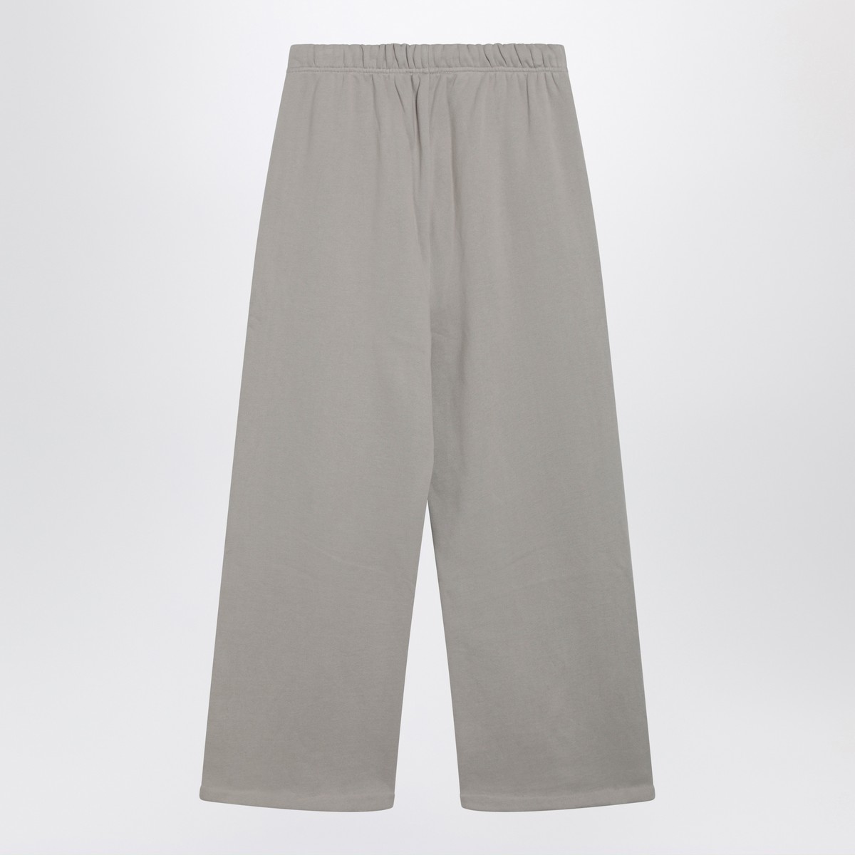 Wide-leg trousers by Fear of God Essentials in smoke-grey cotton, featuring an elasticated drawstring waist, two side pockets, front rubber logo patch and contrasting front print.