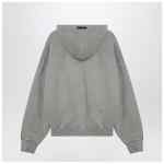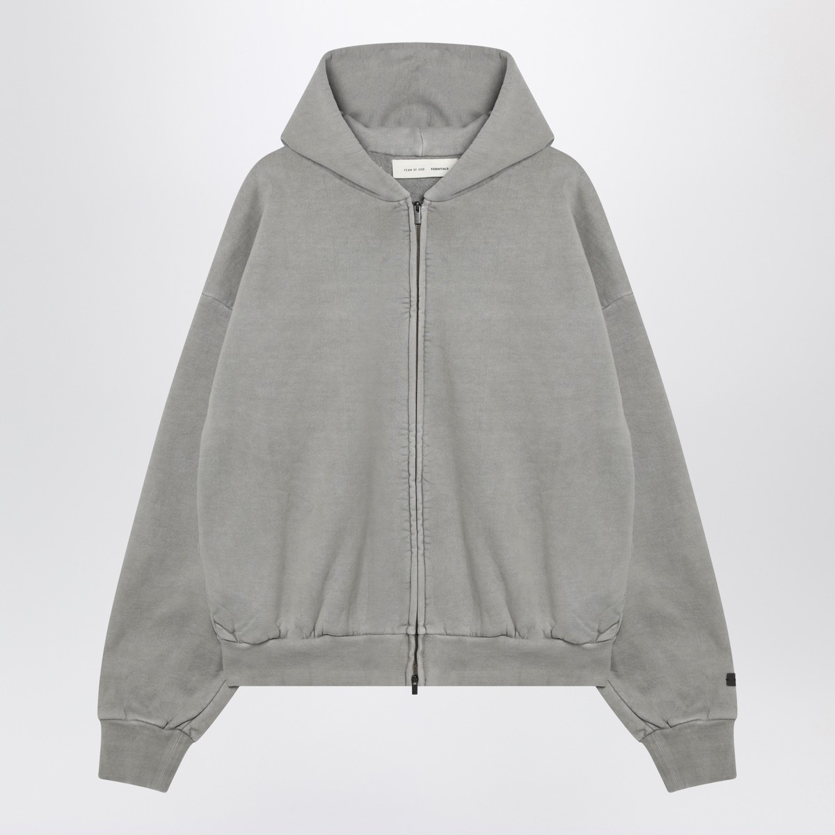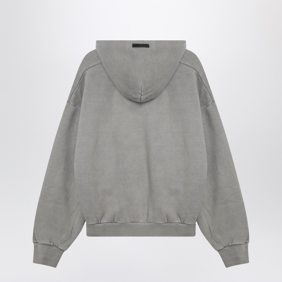 Smoke-grey brushed cotton hoodie by Fear of God Essentials, featuring two side pockets, long sleeves with embossed-logo wrist patch, dropped shoulders, double-layer hood with embossed-logo patch, two-way front zip and ribbed trims.