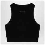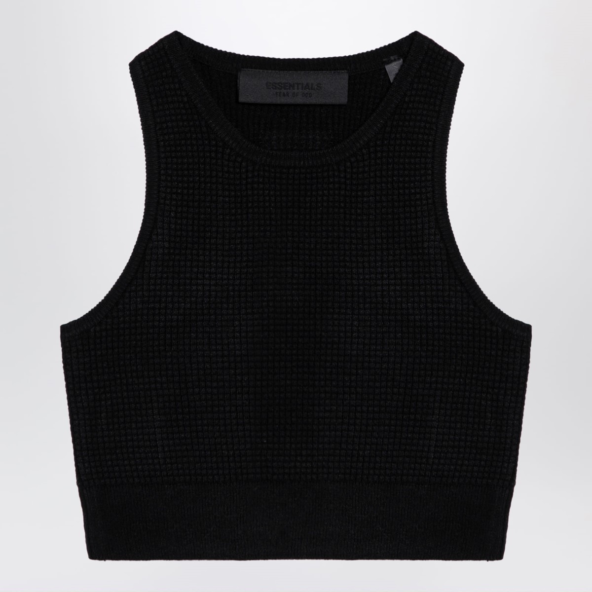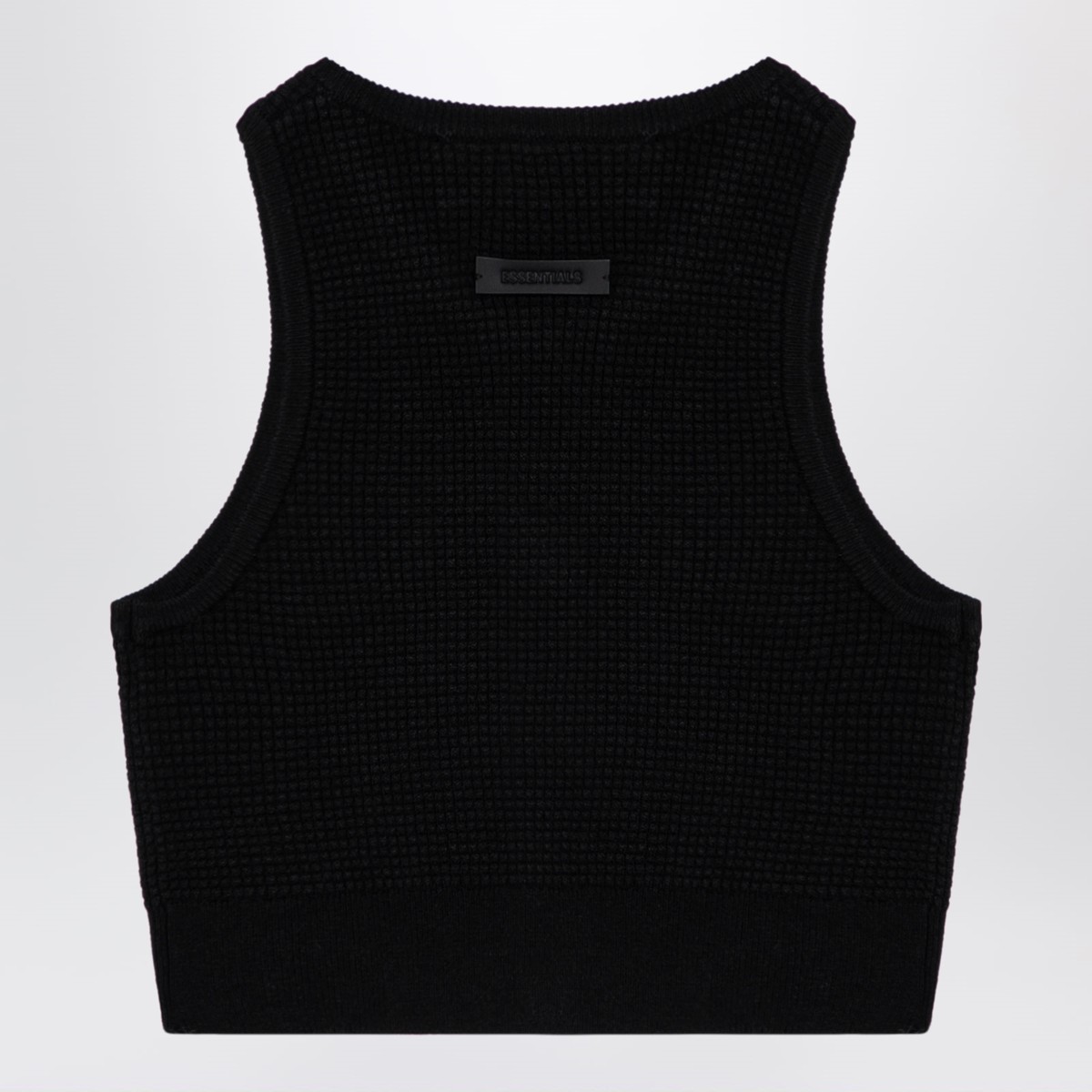 Short crew-neck tank top in black honeycomb by Fear Of God Essentials, featuring rubberized logo patch on the back and ribbed hem.