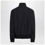Navy blue virgin wool Fear of God jacket, featuring a high collar, long sleeves, front closure with double zip, two side welt pockets, ribbed knit edges, and a rear logo patch.