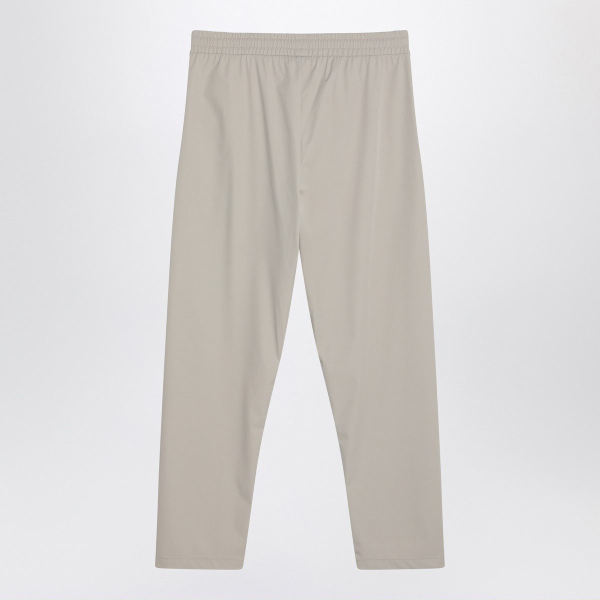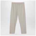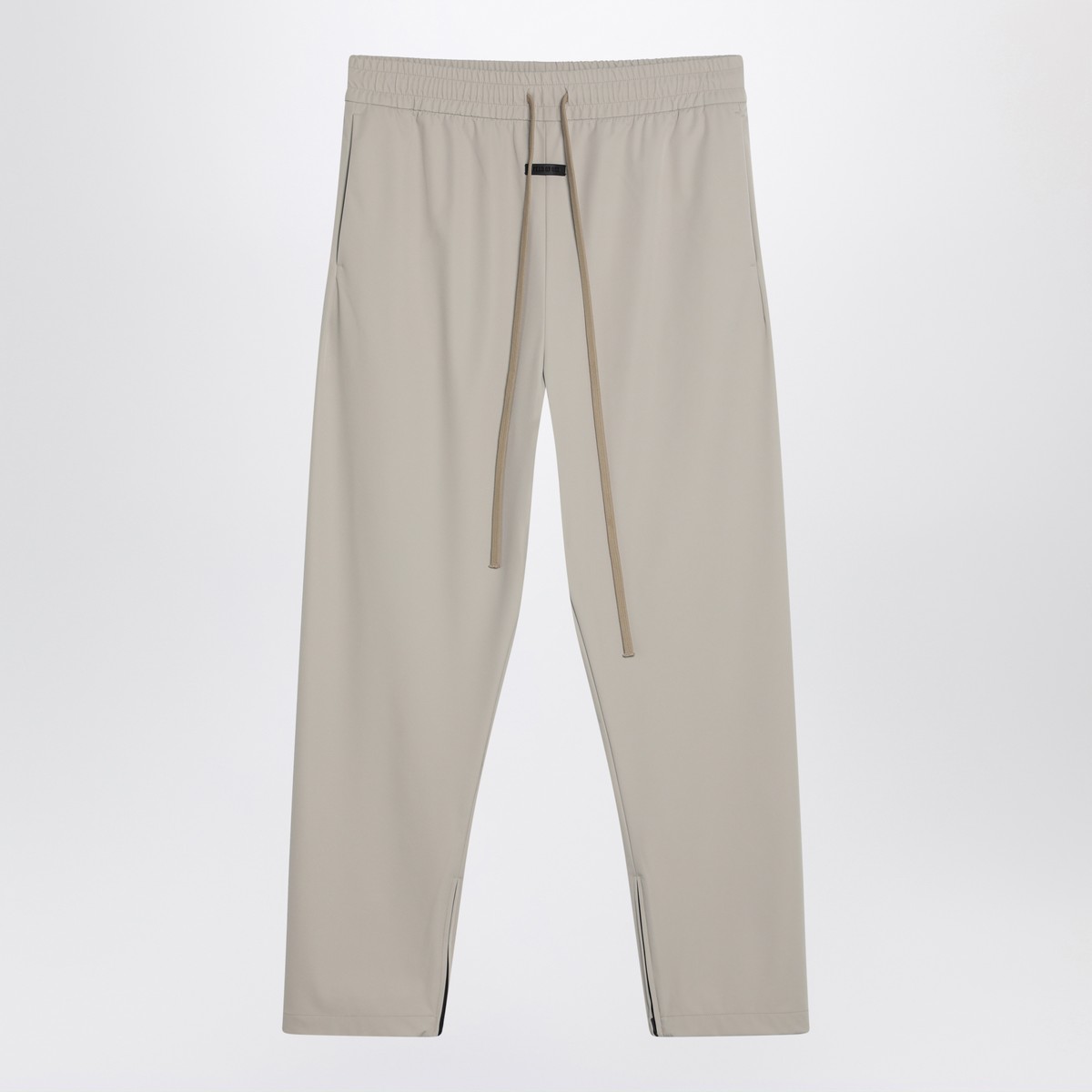 Fear of God pants in cement-coloured nylon blend, characterized by an elasticized waistband with drawstring, two side welt pockets, and a rubber logo patch on the front.