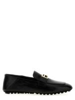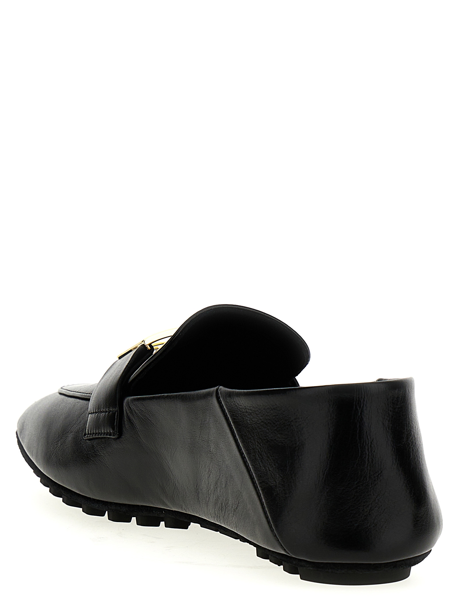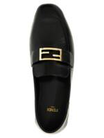 ‘baguette’ leather loafers with front metal logo detail, Suede sole with rubber inserts, Reclining heel.