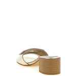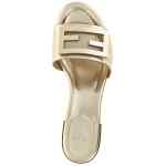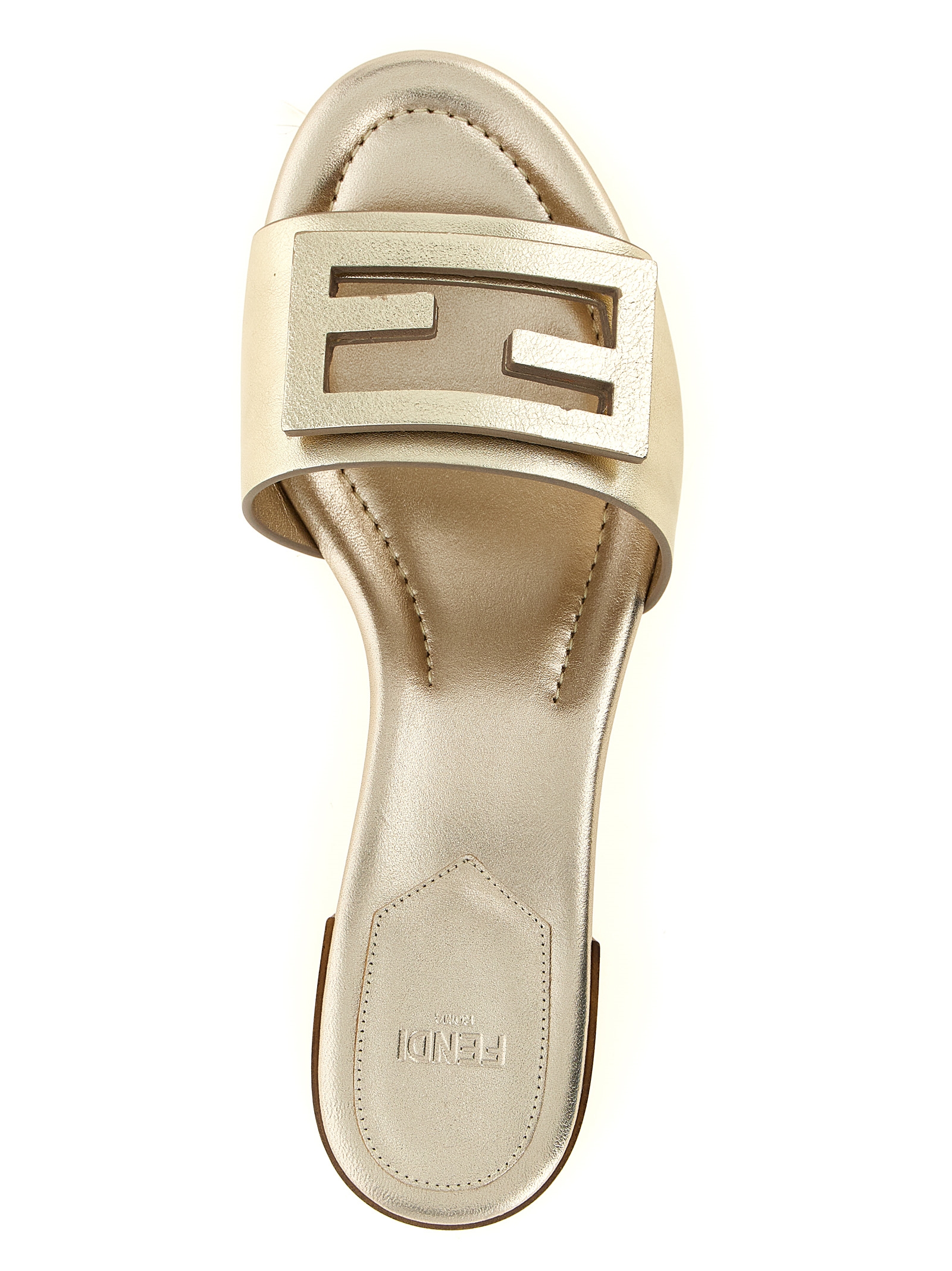 Laminated leather slides finished with handmade tone-on-tone macro stitching, Round toe, Wide band with front cut-out ff ‘baguette’ pattern, Covered wide heel and leather sole. Size and Fit – EU WOMAN – Heels: 4.5 cm