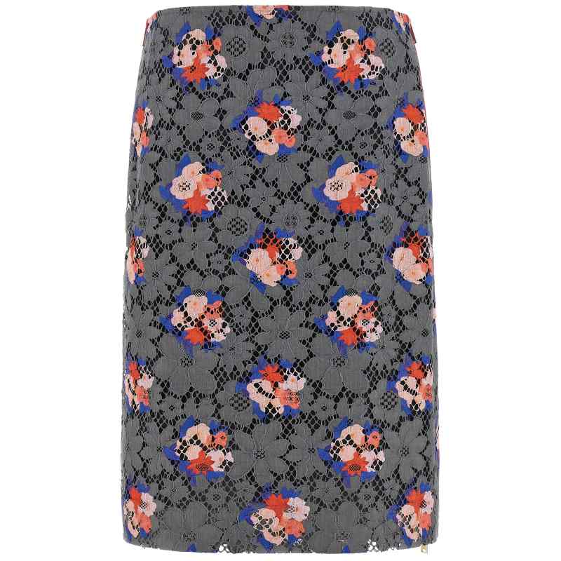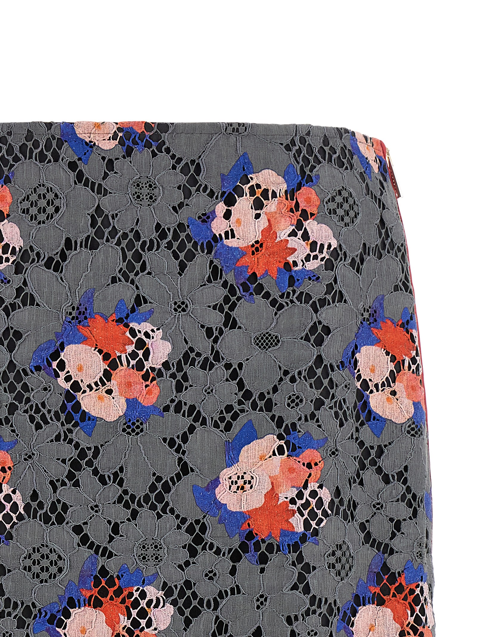 Lace midi skirt with archival floral motif, See-through effect, Contrast ‘fendi bouquet’ print, Flared longuette model, Side zips, Lining.