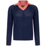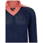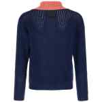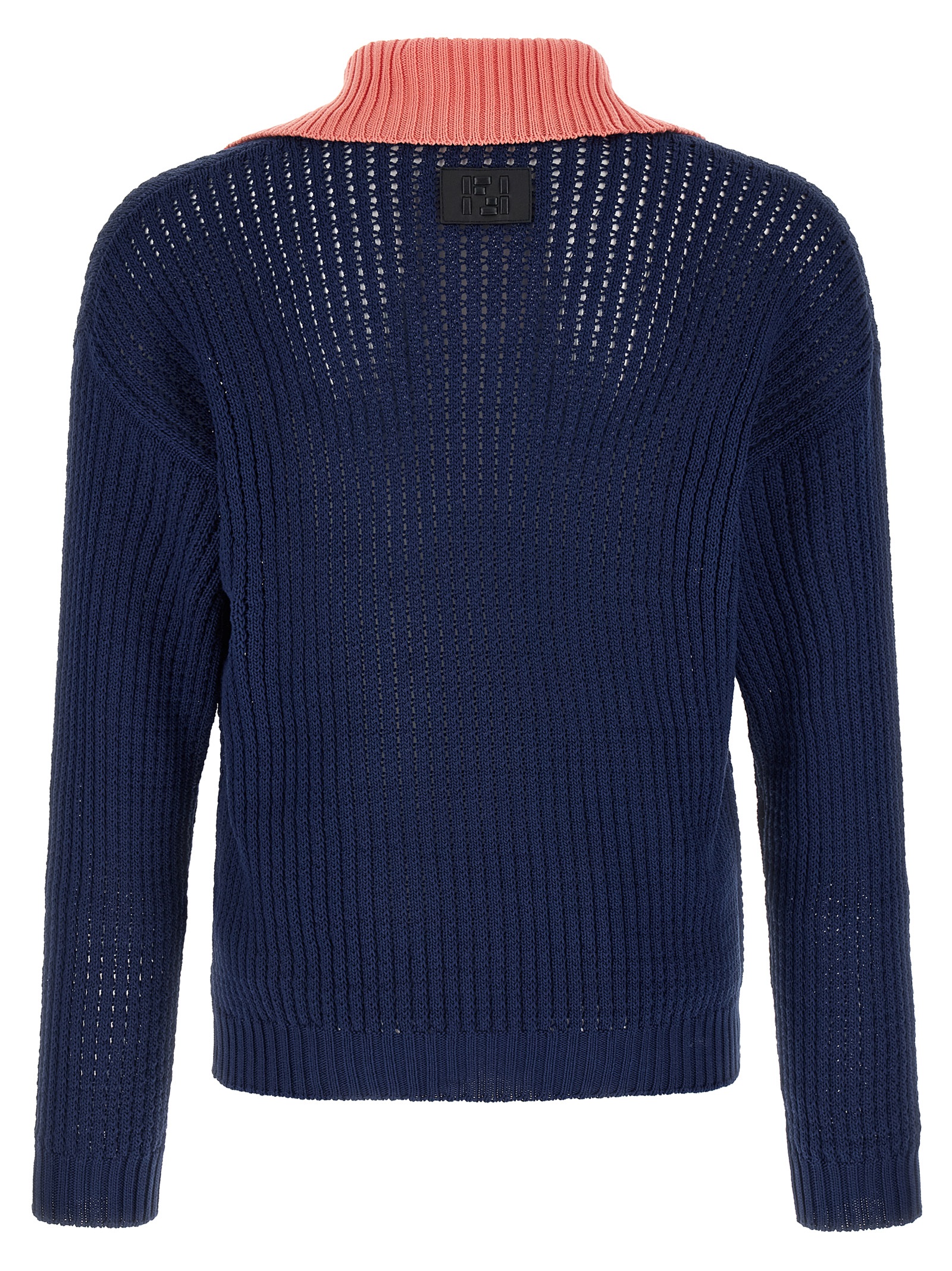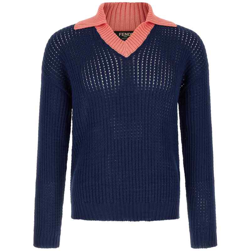 Cotton yarn sweater with see-through effect cablé braided pattern, Contrast colorblock v-neck collar, Long sleeves with cuffs and dropped shoulders, Leather logo tag with ‘ff selleria’ detail. Size and Fit – True to size fit