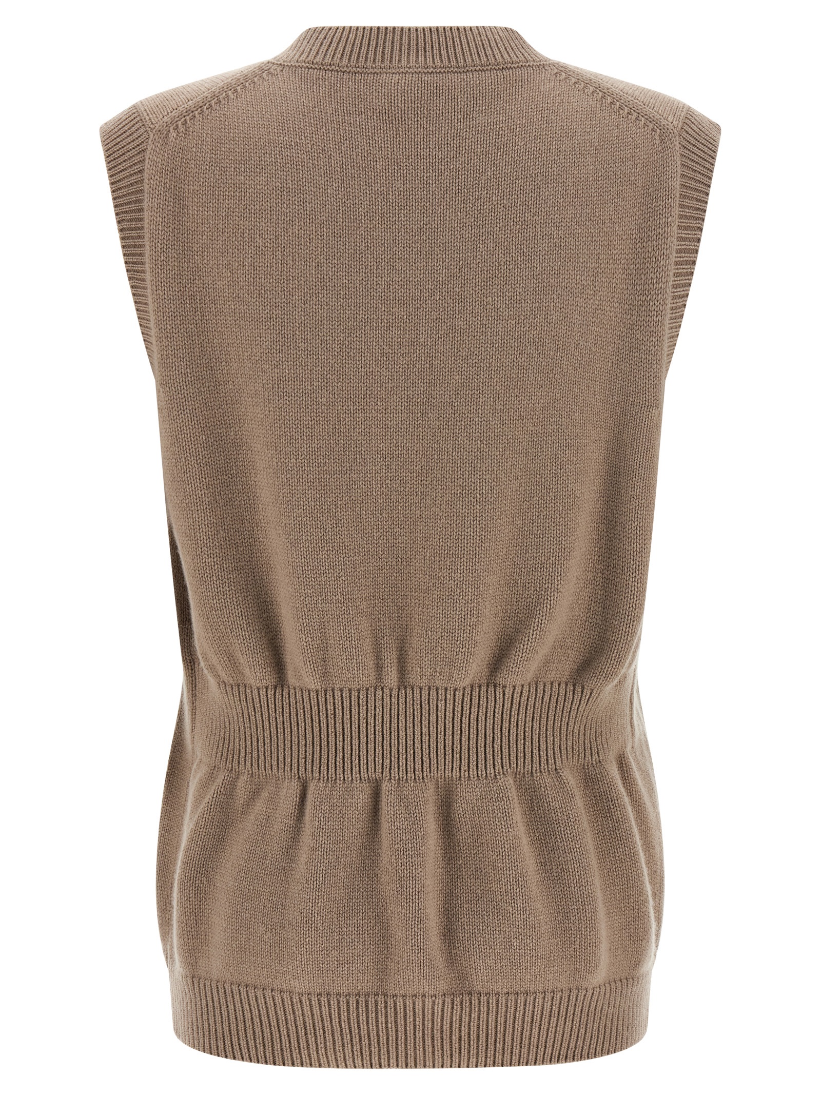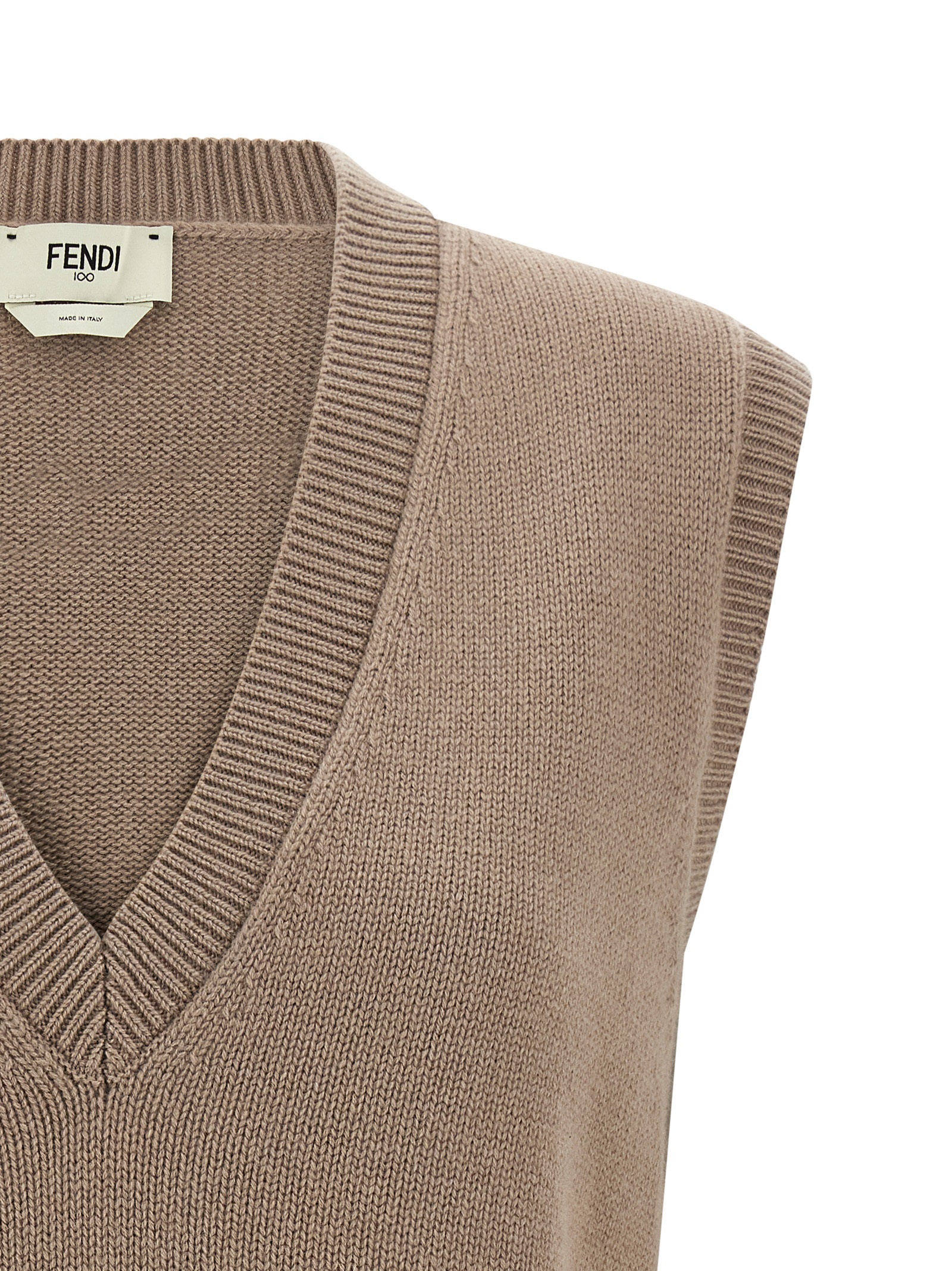 Cashmere vest with fendi roma logo embroidery on the front, Ribbed elastic insert at the back waist, V-neck. Size and Fit – Oversized fit