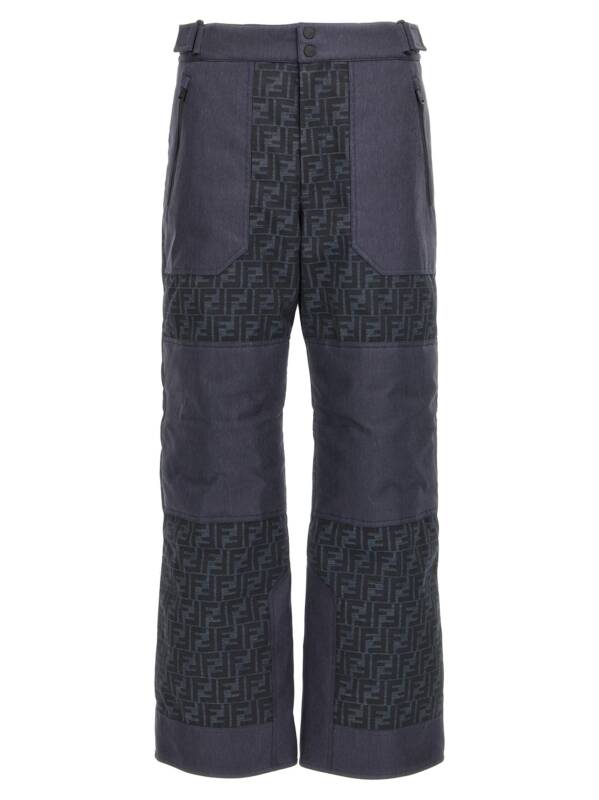 Water-repellent denim-effect jacquard ‘ff’ technical fabric ski pant, High-waist model, Adjustable side straps, Zipper and button closure, Pockets.Ckets. Size and Fit – true to size fit