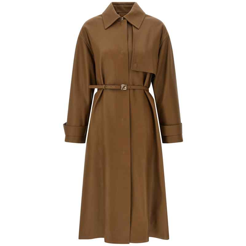 Nappa midi trench coat, Shirt collar with embossed logo at the back, Asymmetrical bavolet and front snap button closure, Pockets, Long sleeves with dropped shoulder, Cape and back split, Belt with removable metallic ff logo buckle, Monogram viscose lining. Size and Fit – True to size fit