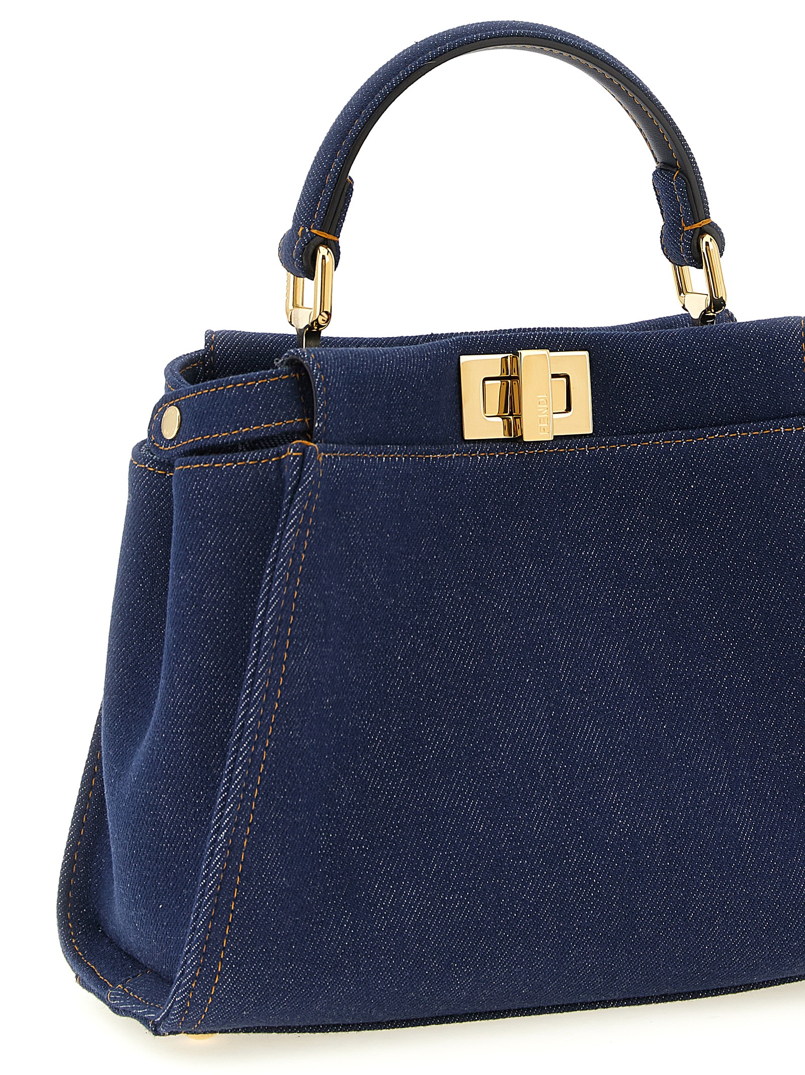 Peekaboo’ mini denim handbag with dark blue wash, Contrast stitching, Tone-on-tone denim lining, Rigid partition in denim-effect ff jacquard, Iconic metal turn lock on both sides, Fixed handle, Adjustable and removable calf leather shoulder strap.