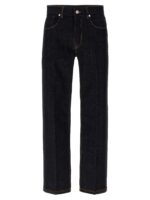 Cotton denim jeans with contrast stitching, Tone-on-tone ‘selleria’ stitching, Back logo embroidery, Five pockets, Zip and button closure, Straight leg with stretched pleat. Size and Fit – true to size fit