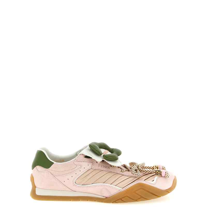 ‘fendi wave pulse’ pleated satin sneakers with tone-on-tone suede inserts, Contrasting smooth leather heel, Folded and removable tongue decorated with corolla and three-dimensional logo, With double laces: elastic and tubular with bead and cubic metal detail with ff cut-out, Embossed logo on the side and on the tongue, Rubber running sole with wraparound edge on the side and diagonal f pattern.