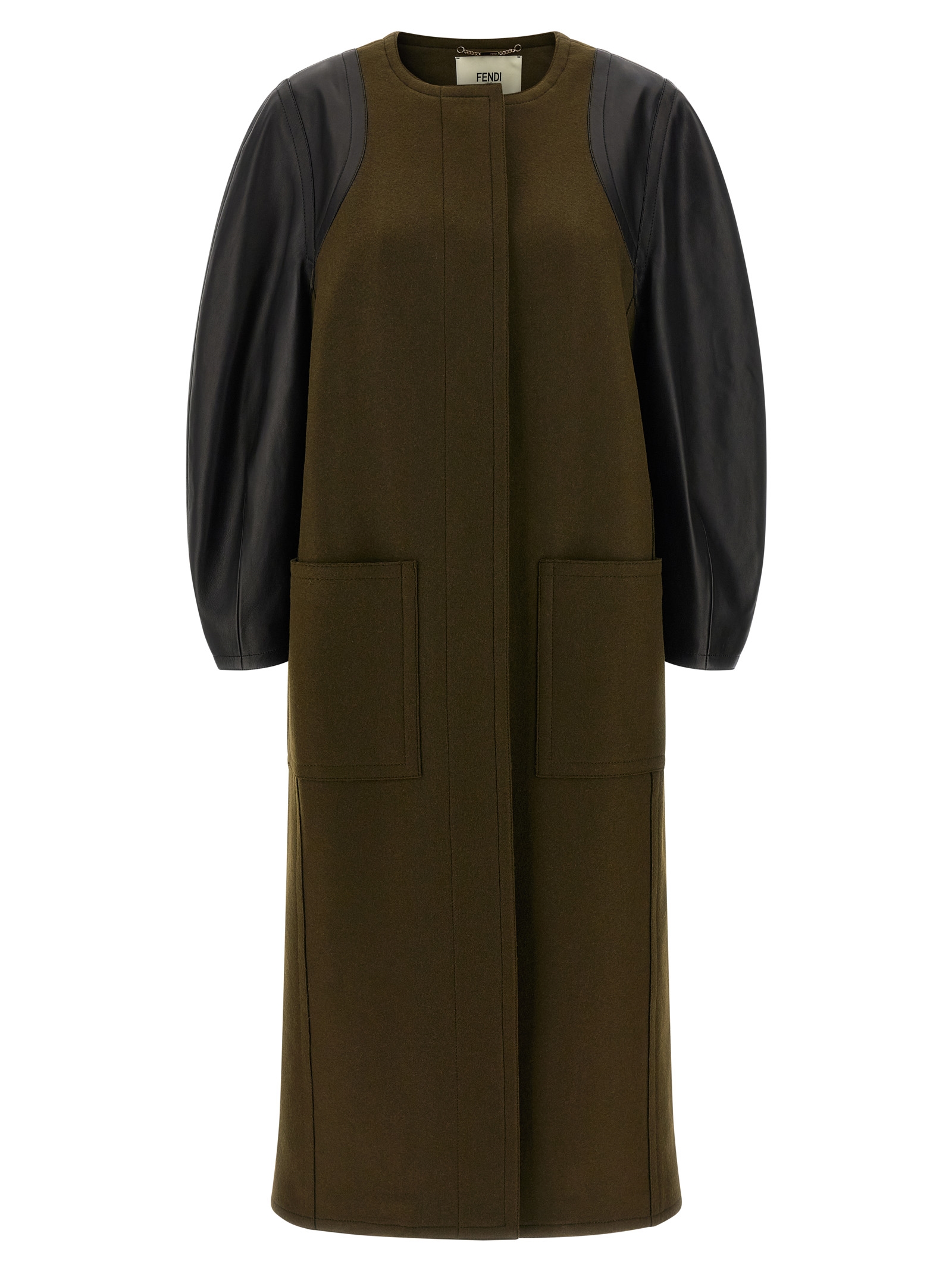 Wool felt’ wool crewneck coat with concealed front button closure, Long leather sleeves, Side pockets, Mini belt at the waist with adjustable and removable logo. Size and Fit – True to size fit