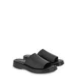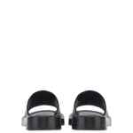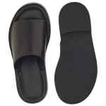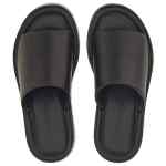 crossover-strap leather slides from Ferragamo featuring crossover strap detail, slip-on style, open toe, flat rubber sole, branded insole, black and calf leather. Leather flat sandals