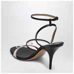 High-heeled sandals by Salvatore Ferragamo in black and nude leather, featuring a thin strap with bow detail, ankle strap with buckle, insole with logo, and leather sole.