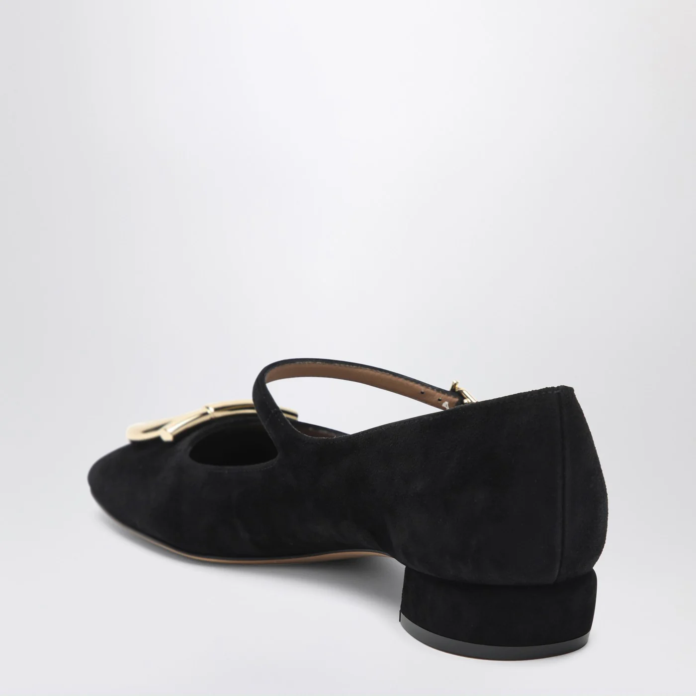 Black suede Ferragamo ballerina characterized by an adjustable strap golden metal Gancini logo on the front square toe wide heel and leather sole.