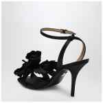 Ferragamo sandal in black satin, featuring high stiletto heel, oversized flower with shaped petals on the front, adjustable ankle strap fastening and leather sole.