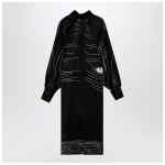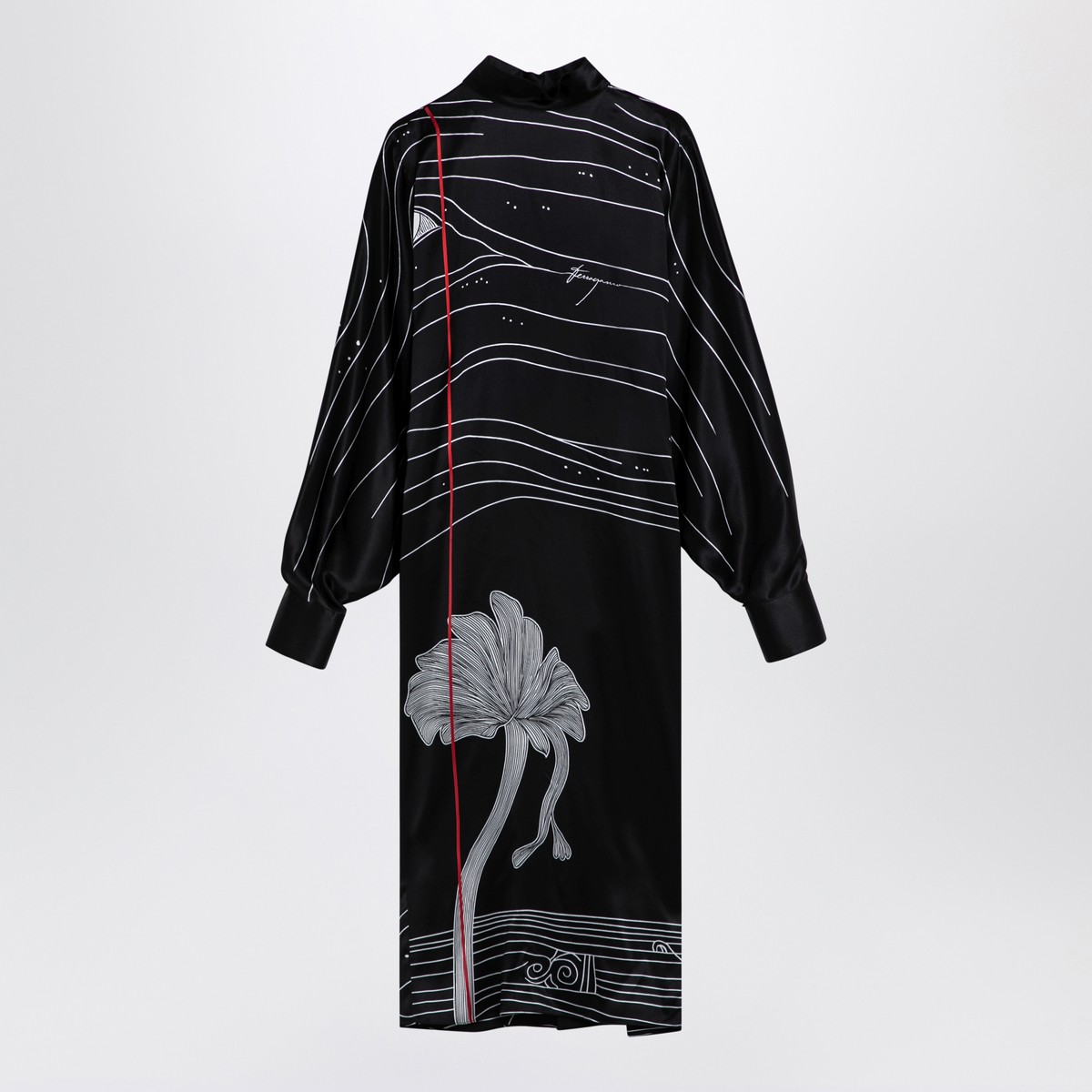 Black silk satin midi dress by Ferragamo with contrasting Spirit print, featuring long wide sleeves with button cuff, front slit and V-neckline.