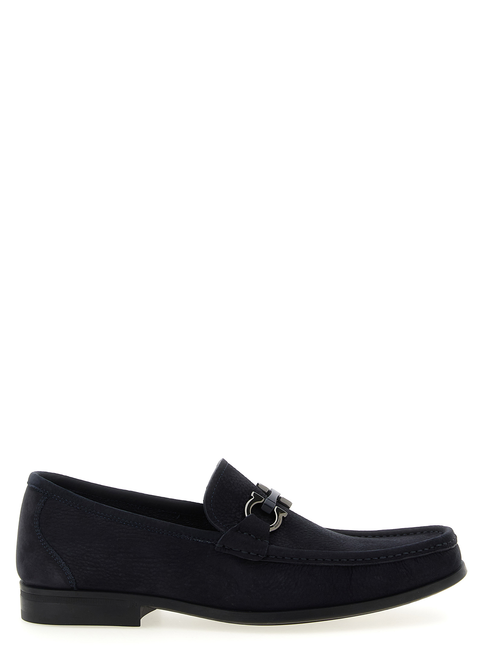 ‘grandioso’ nubuck loafers with metal ‘gancini’ clamp and front stitched tray, Tubular construction model, Flexible rubber sole. Size and Fit – US FERRAGAMO SIZE – EEE fit