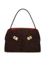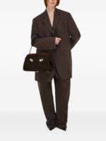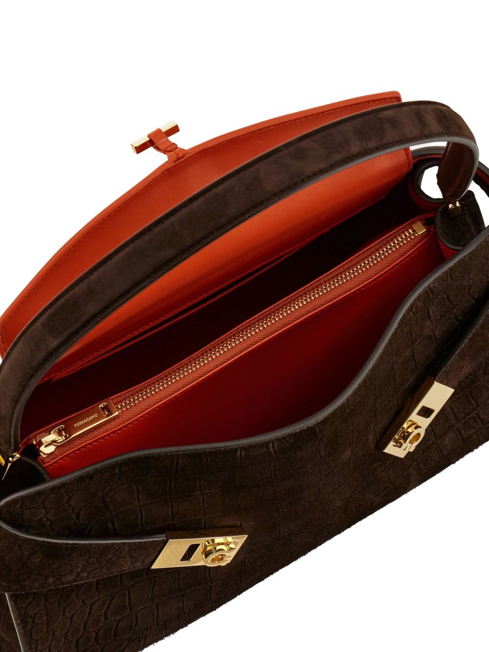 Sumptuous suede and a bold alligator print bring to life this season’s edition of the Soft Hug bag. The captivating texture confirms a high end look, with golden Hug buckles on the front panel. Inside, the leather lined interior has a central zip compartment and ample space for essentials, fastened by a toggle in the center. Adjustable, removable shoulder strap dark brown gold-tone buckle adjustable removable strap interior zip-compartment toggle-fastening Hug small leather tote bag.