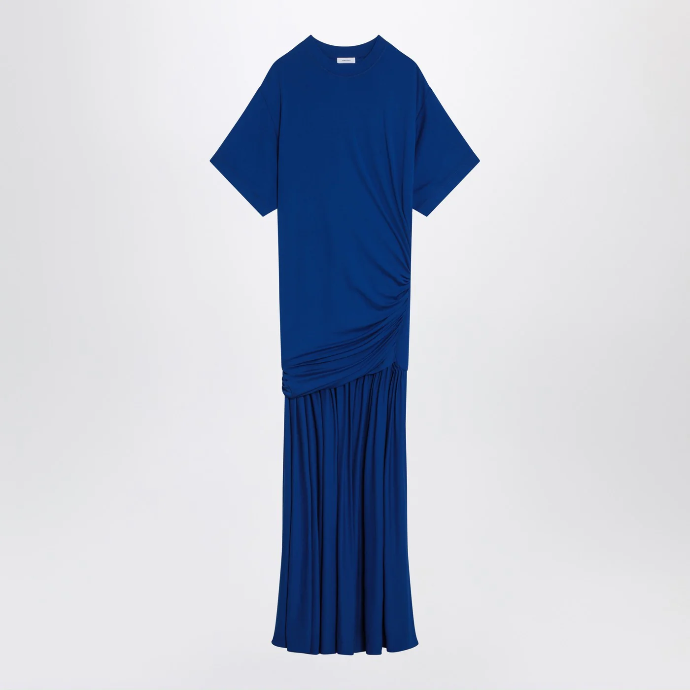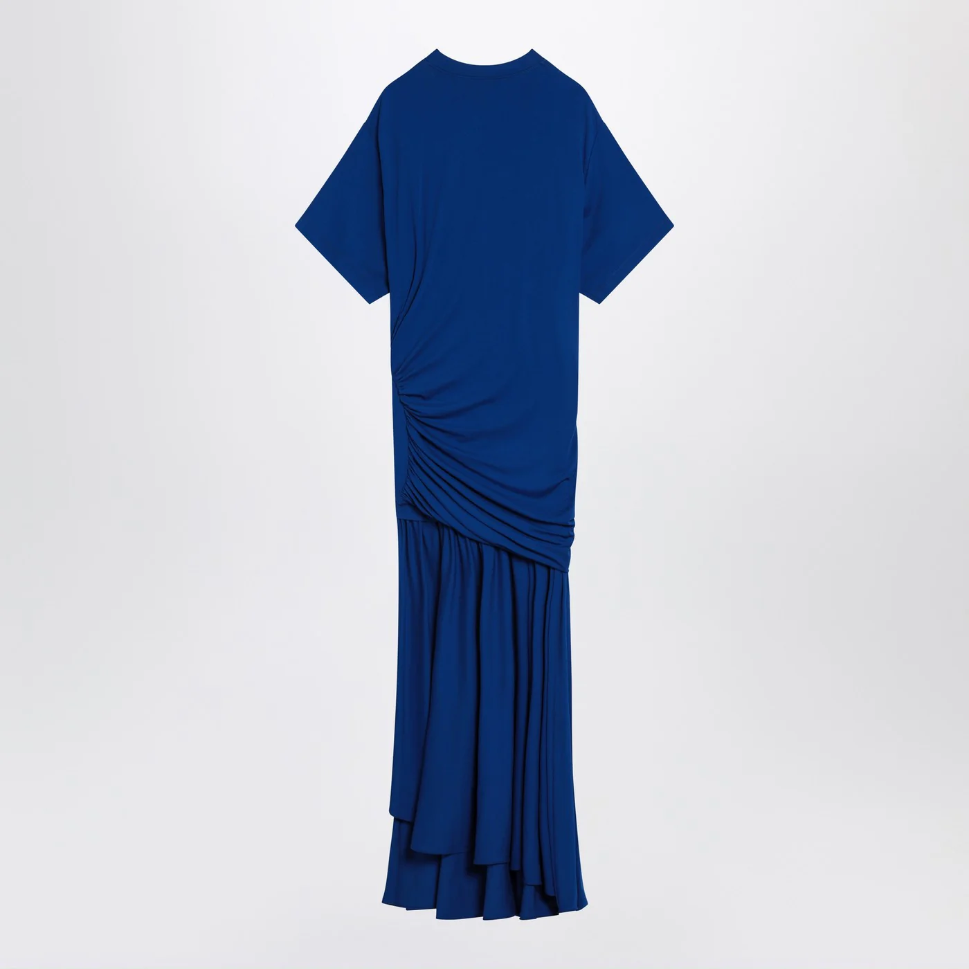 Long dress by Salvatore Ferragamo in blue stretch jersey characterized by a draped detail short sleeves and a pleated skirt with an asymmetrical hem.