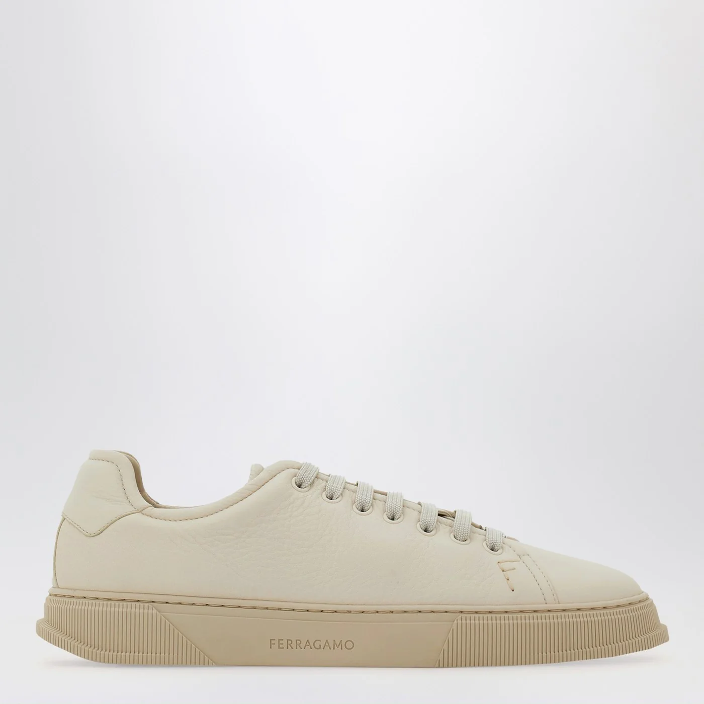 Low-top sneaker by Ferragamo in mascarpone-colored calfskin featuring elastic laces for a slip-on effect F-stitching on the front round toe embossed logo lettering on the tongue logoed metal plaque and grooved rubber sole with cupsole construction.