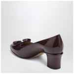 Ferragamo pumps with shiny plum naplak upper featuring Vara bow on the toe, slightly squared neckline, mid heel and leather sole.