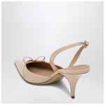 Powder coloured patent leather slingback by Ferragamo featuring a pointed design, a slim shaped heel, a thin bow with a mini gold plaque, an adjustable back strap fastening and a leather sole.