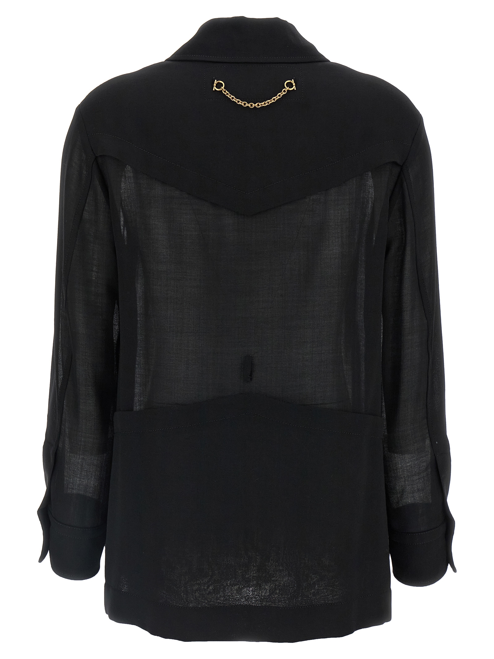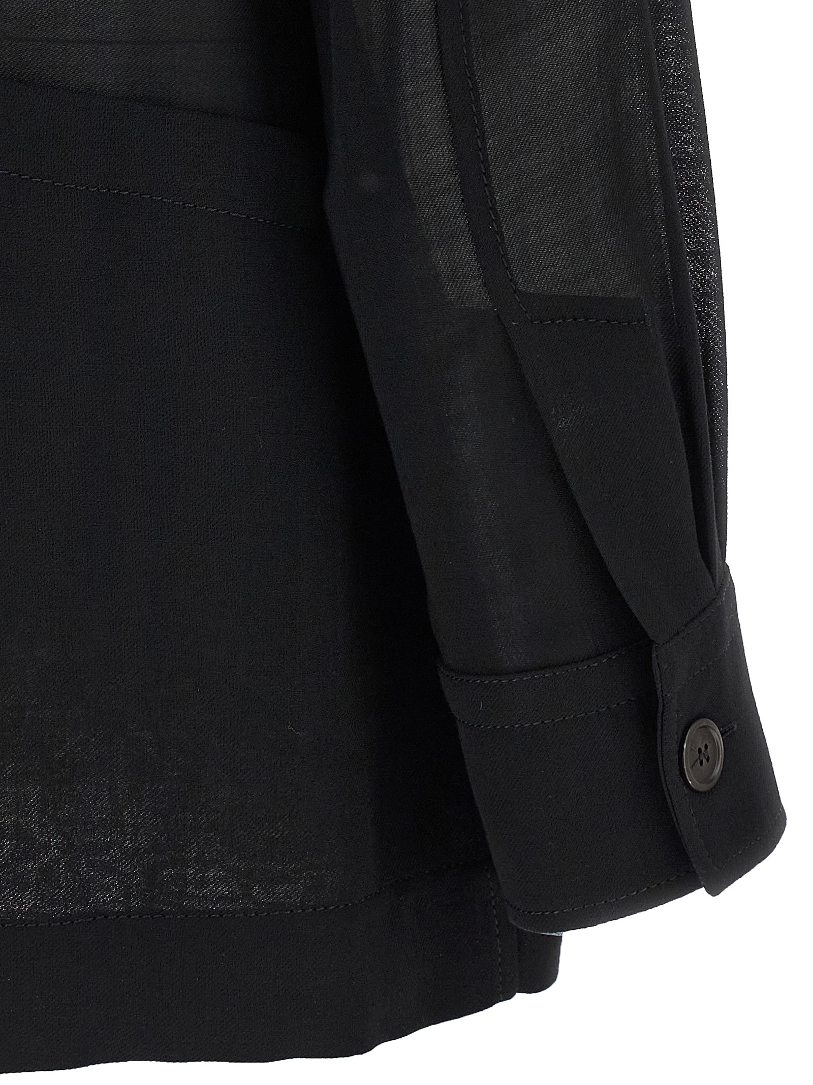 Shirt-style jacket in light semi-transparent wool with front button closure, pockets, long cuffed sleeves, belt loops.