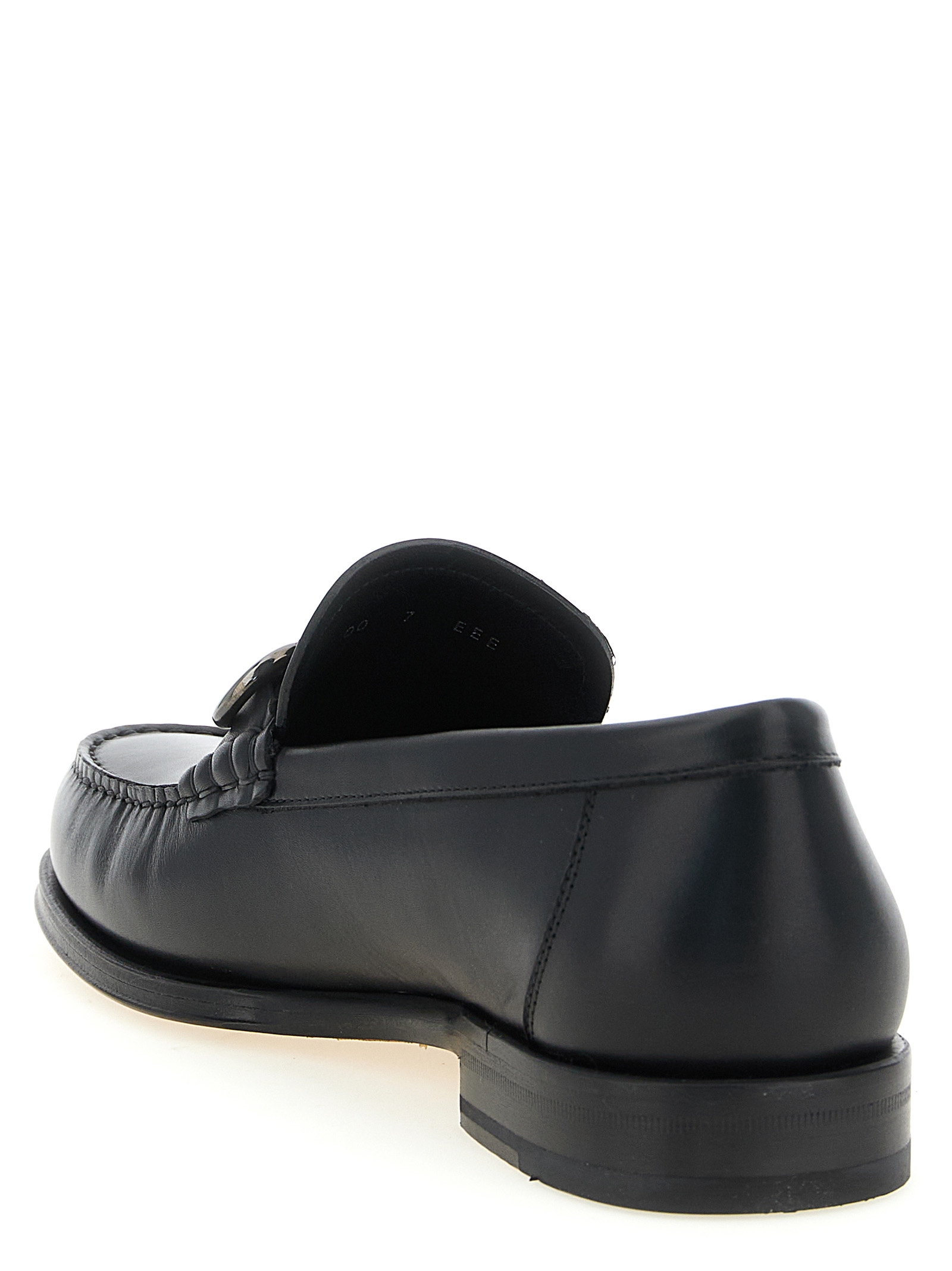 ‘teatro’ leather loafers with tubular construction that involves some stages of processing and hand stitching, Pinched tray with curls, Metal ‘gancini’ clamp detail on the front, Leather sole with half a rubber heel.