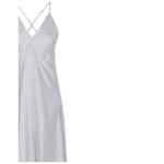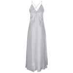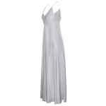 light grey adjustable spaghetti straps plunging neckline gathered detail at bust flowing skirt subtle A-line silhouette Long silk slip dress