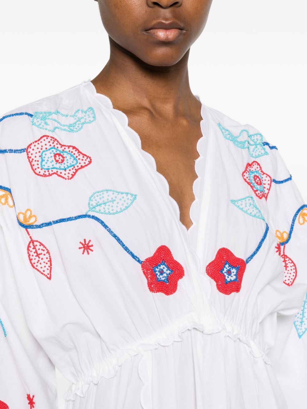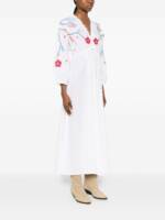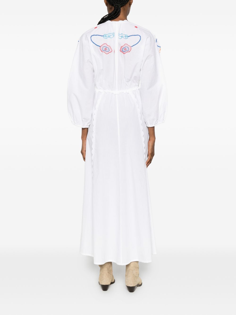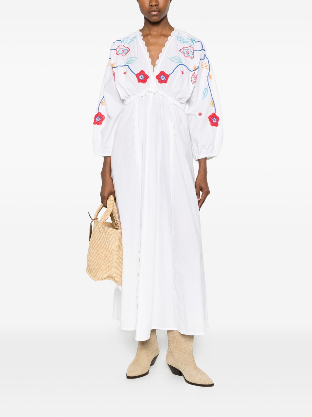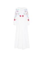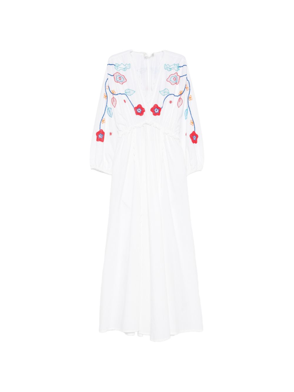 white cotton floral embroidery V-neck long sleeves elasticated waist flared hem Embroidered cotton dress.