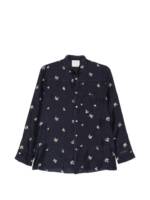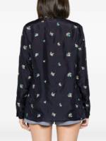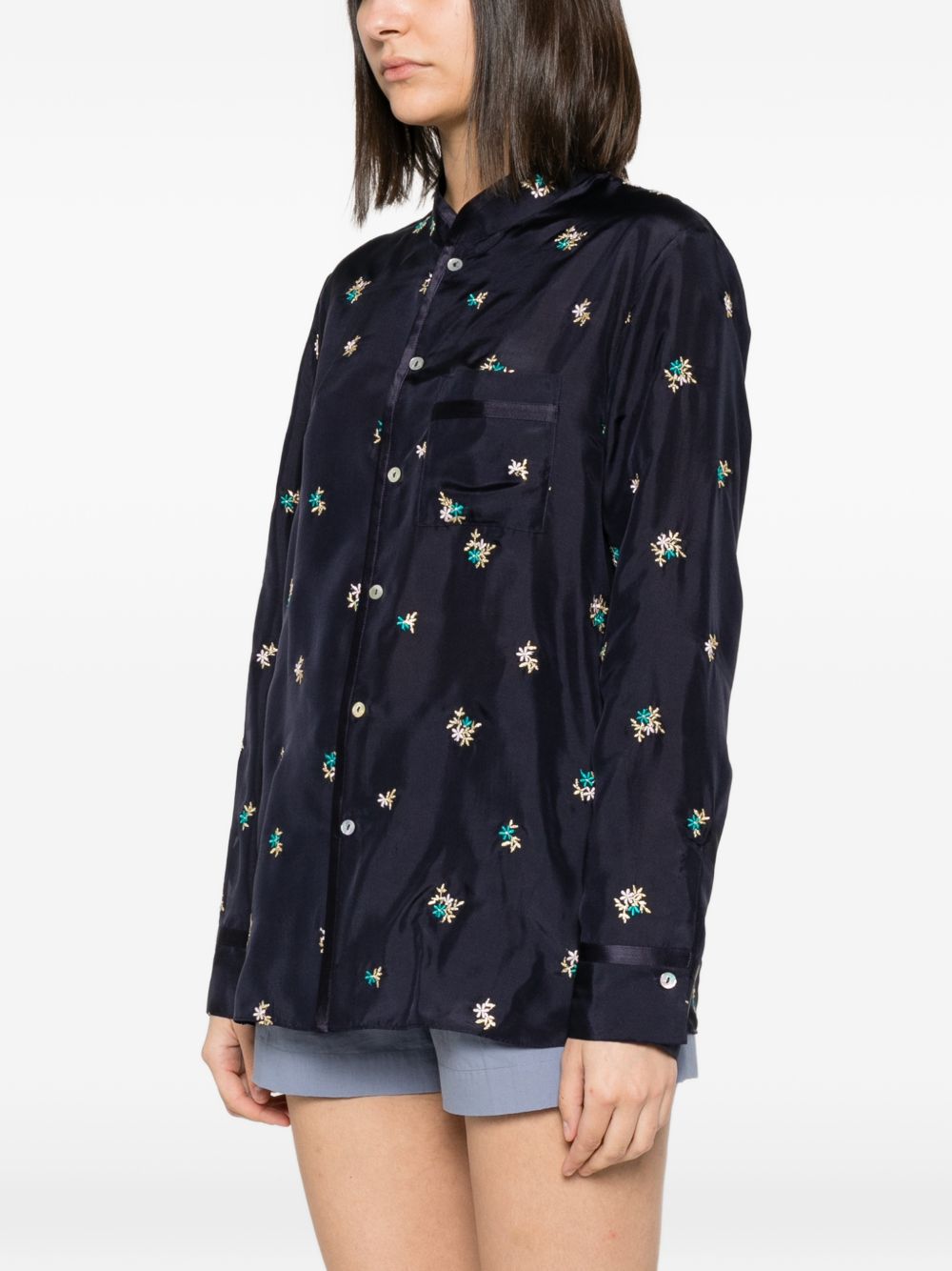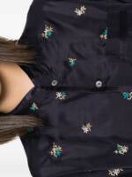 blue silk floral embroidery band collar button fastening long sleeves buttoned cuffs chest pocket Embroidered silk shirt.