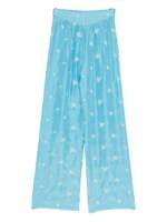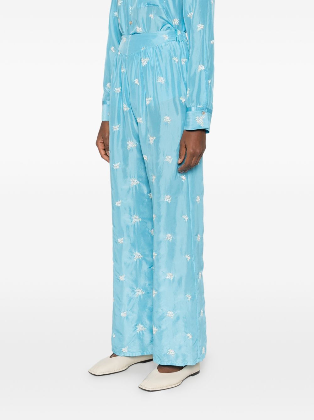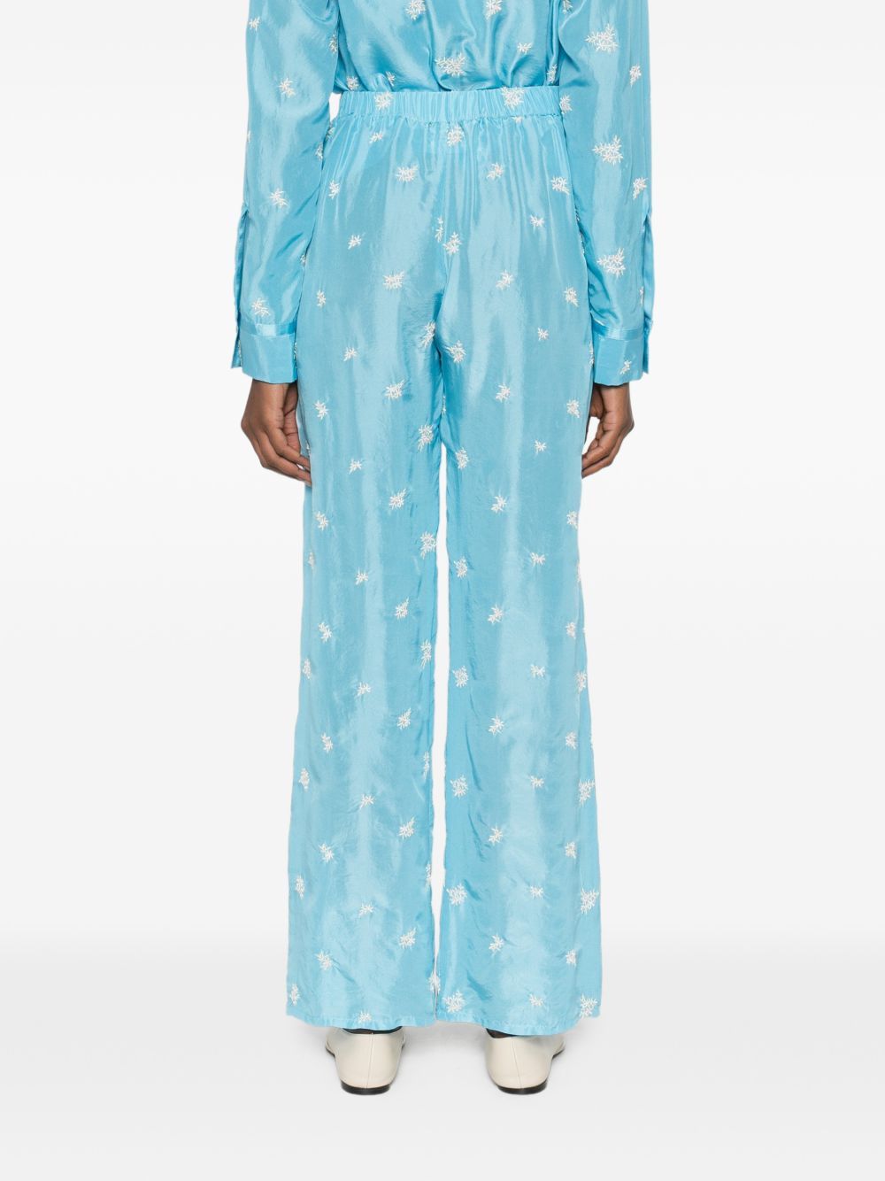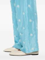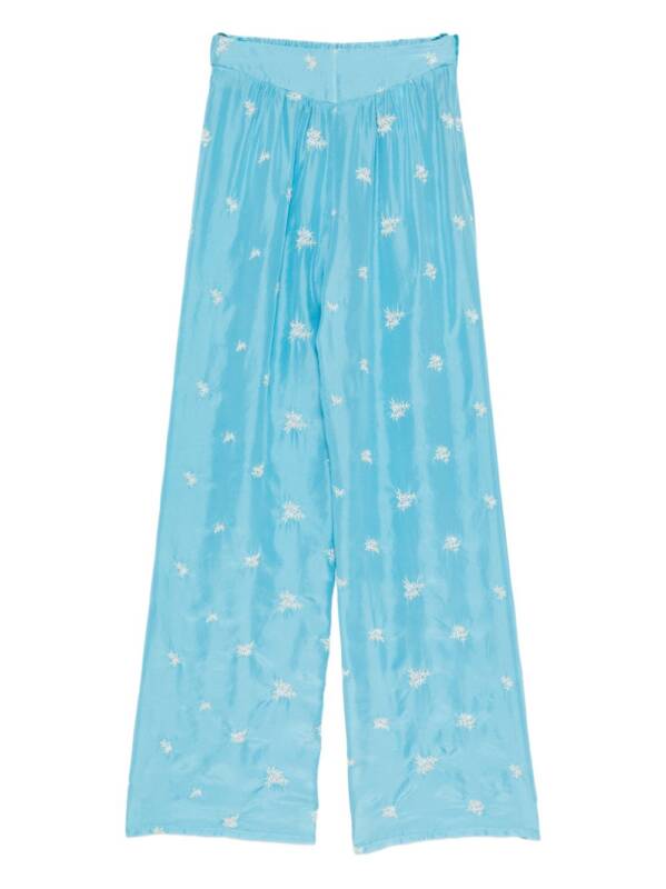 light blue floral embroidery elasticated waistband Embroidered silk trousers.