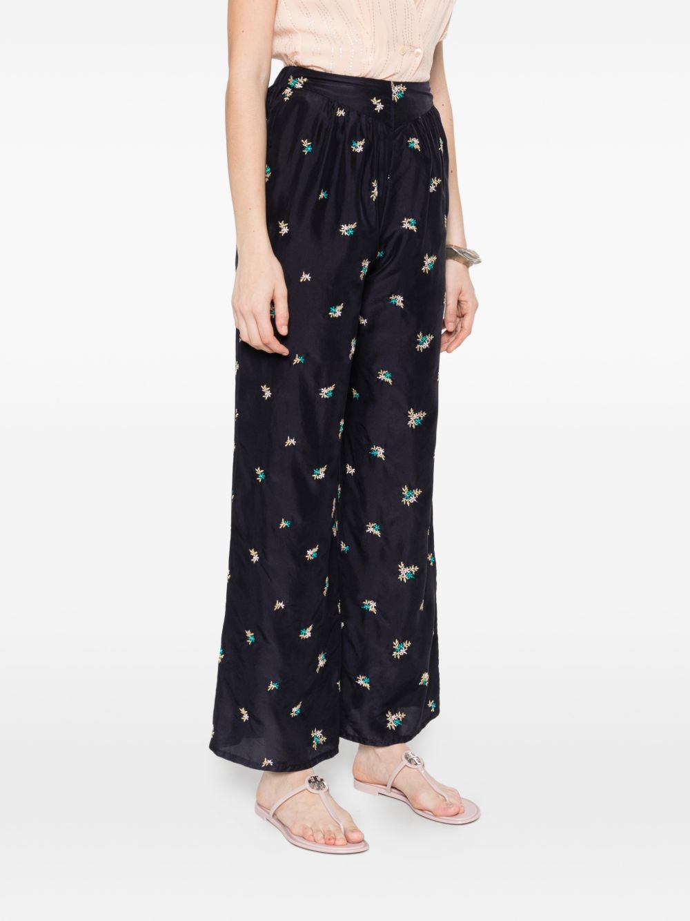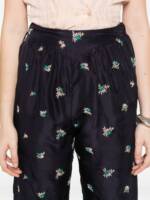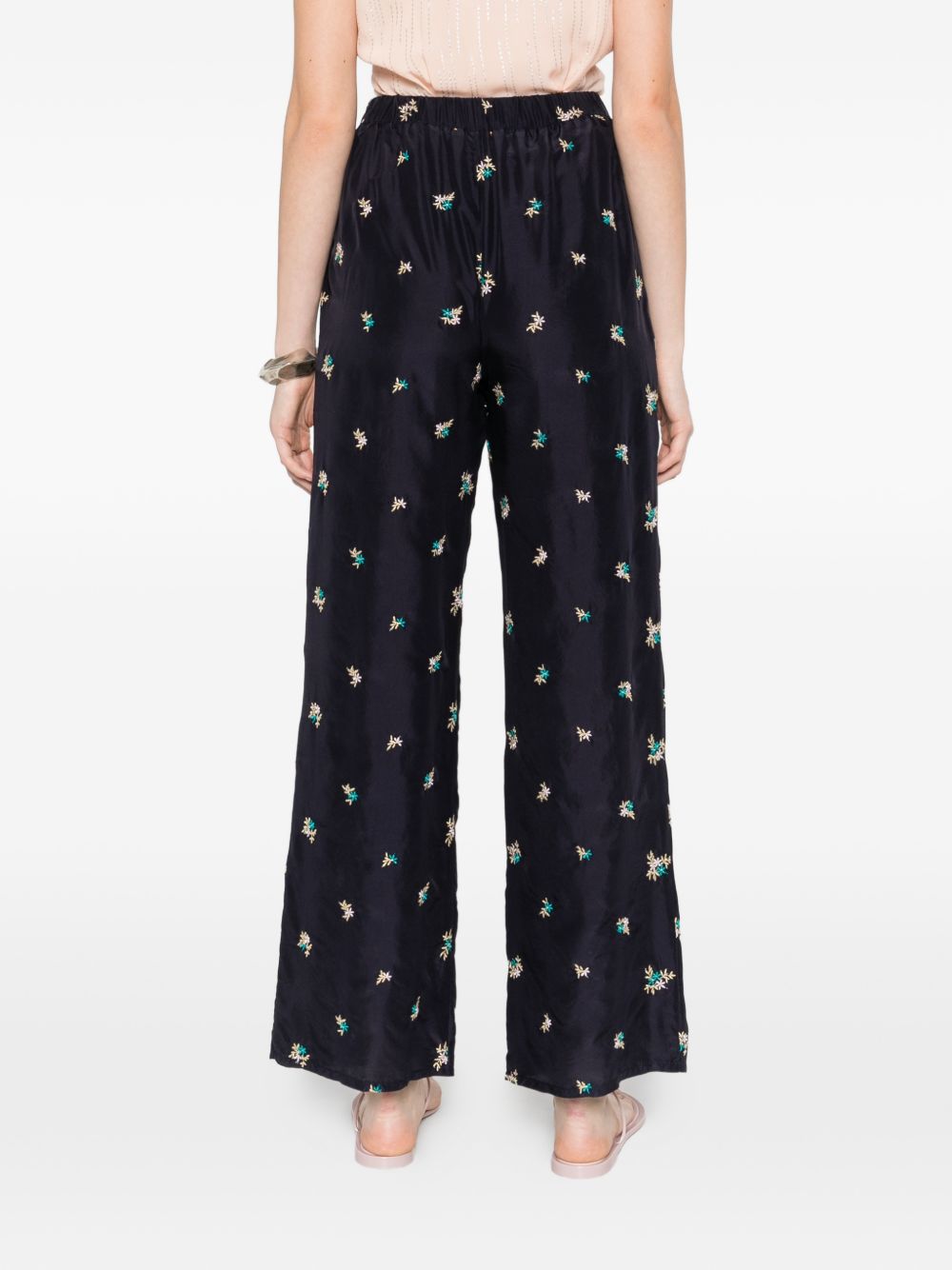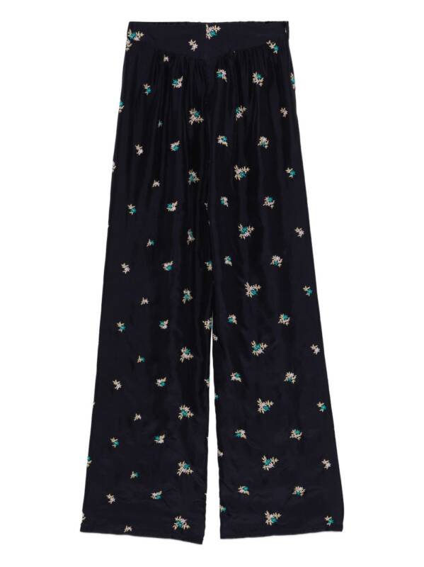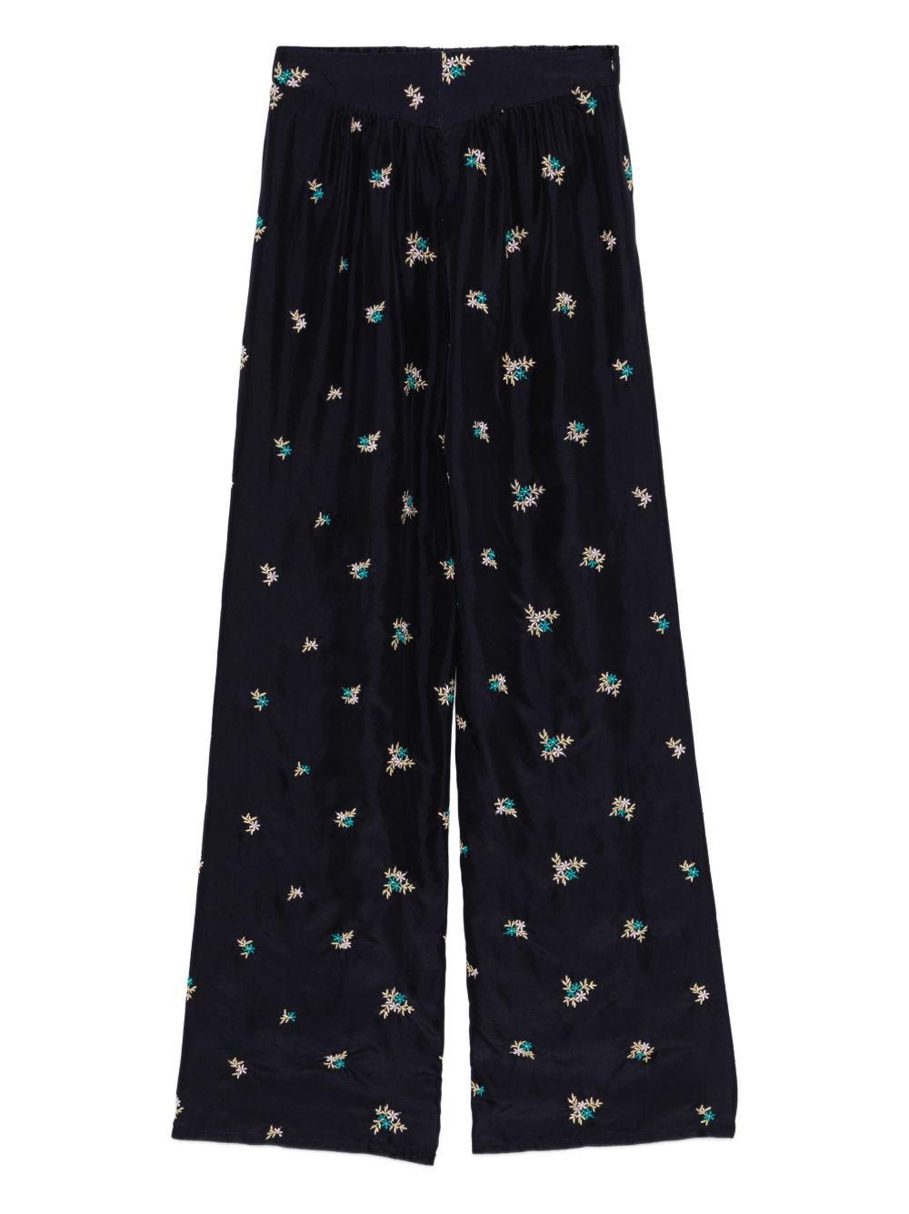 midnight blue floral print drawstring fastening wide leg high-waisted elasticated waistband Embroidered silk trousers.