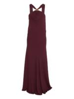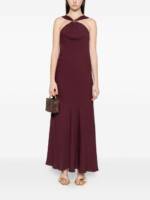 ruby halterneck ring detail sleeveless flared hem Silk blend long dress.