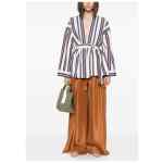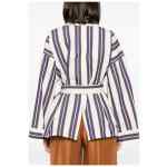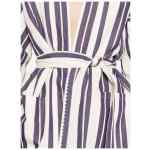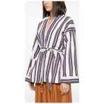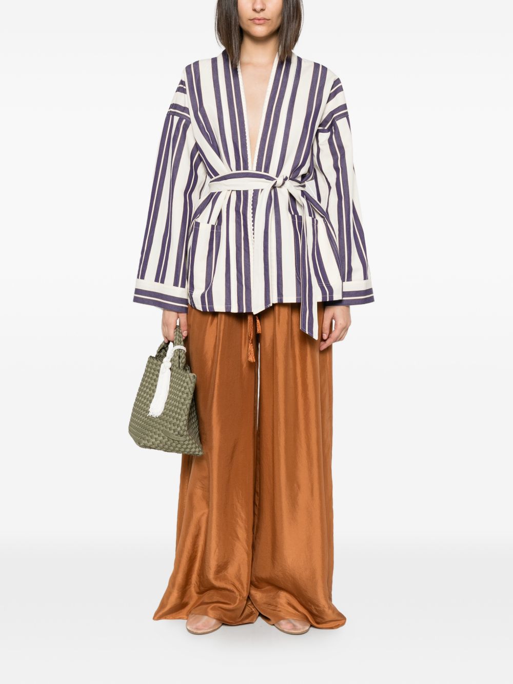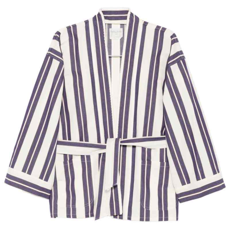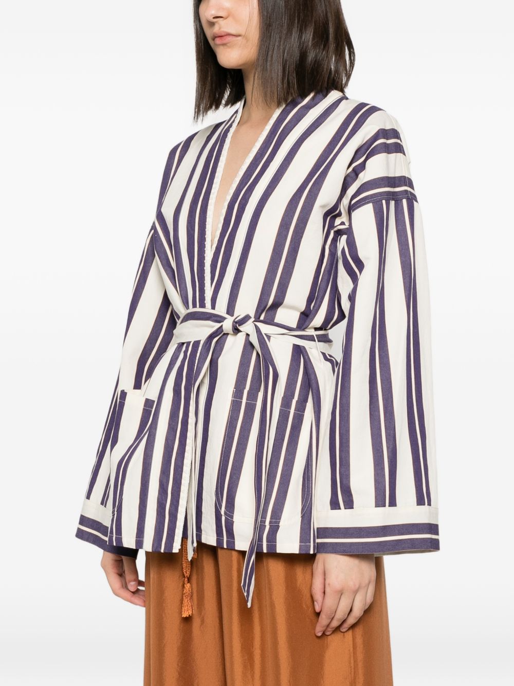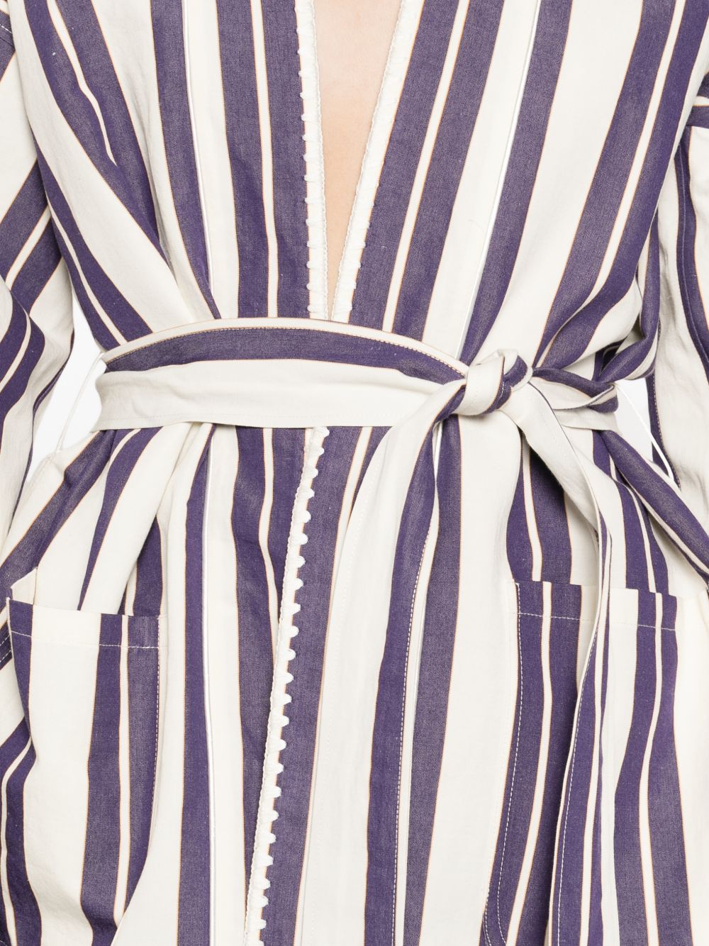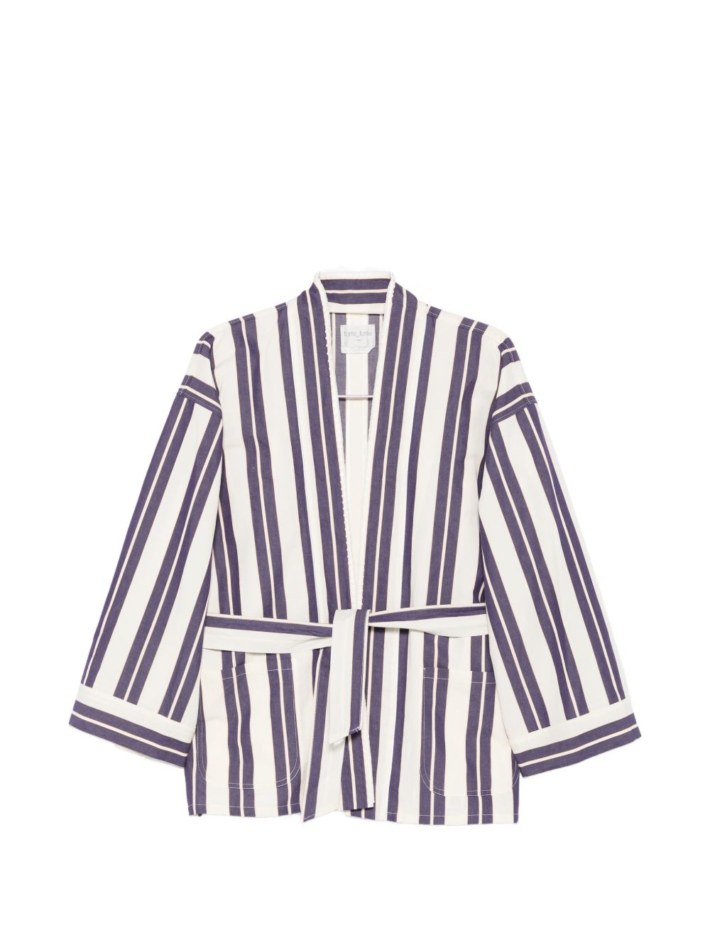 blue/beige stripe pattern wrap design belted waist long sleeves patch pockets straight hem Striped kimono jacket.